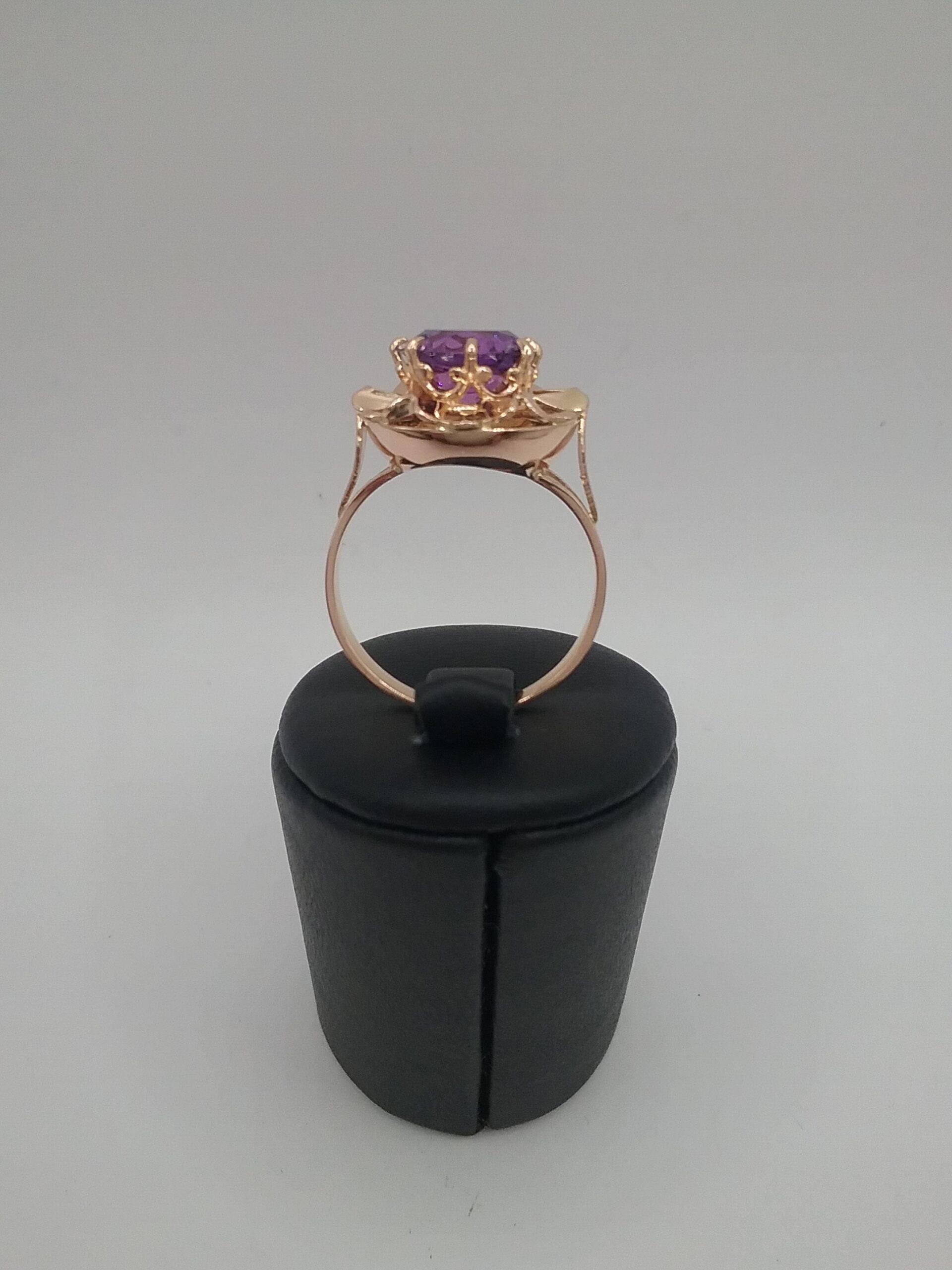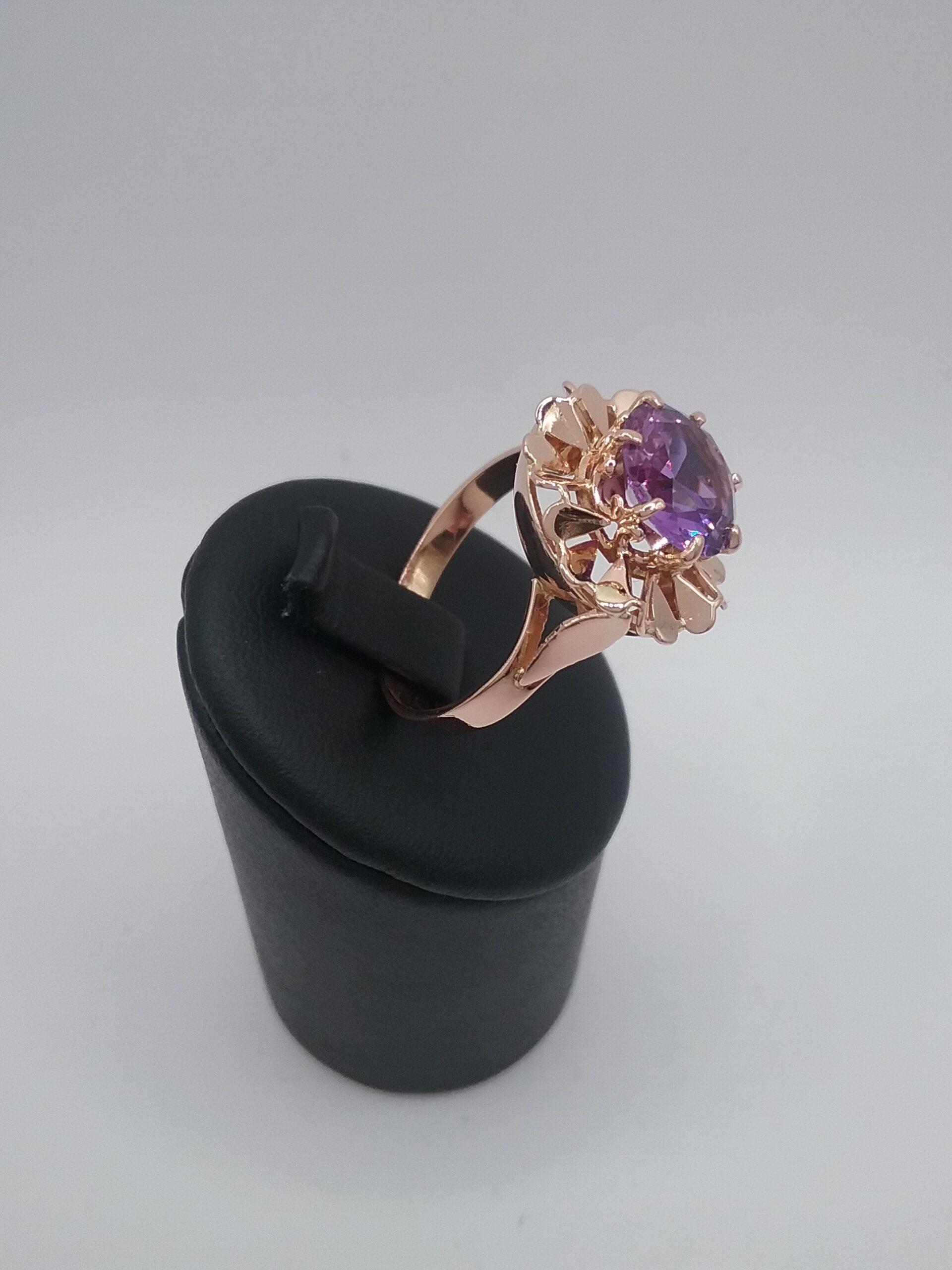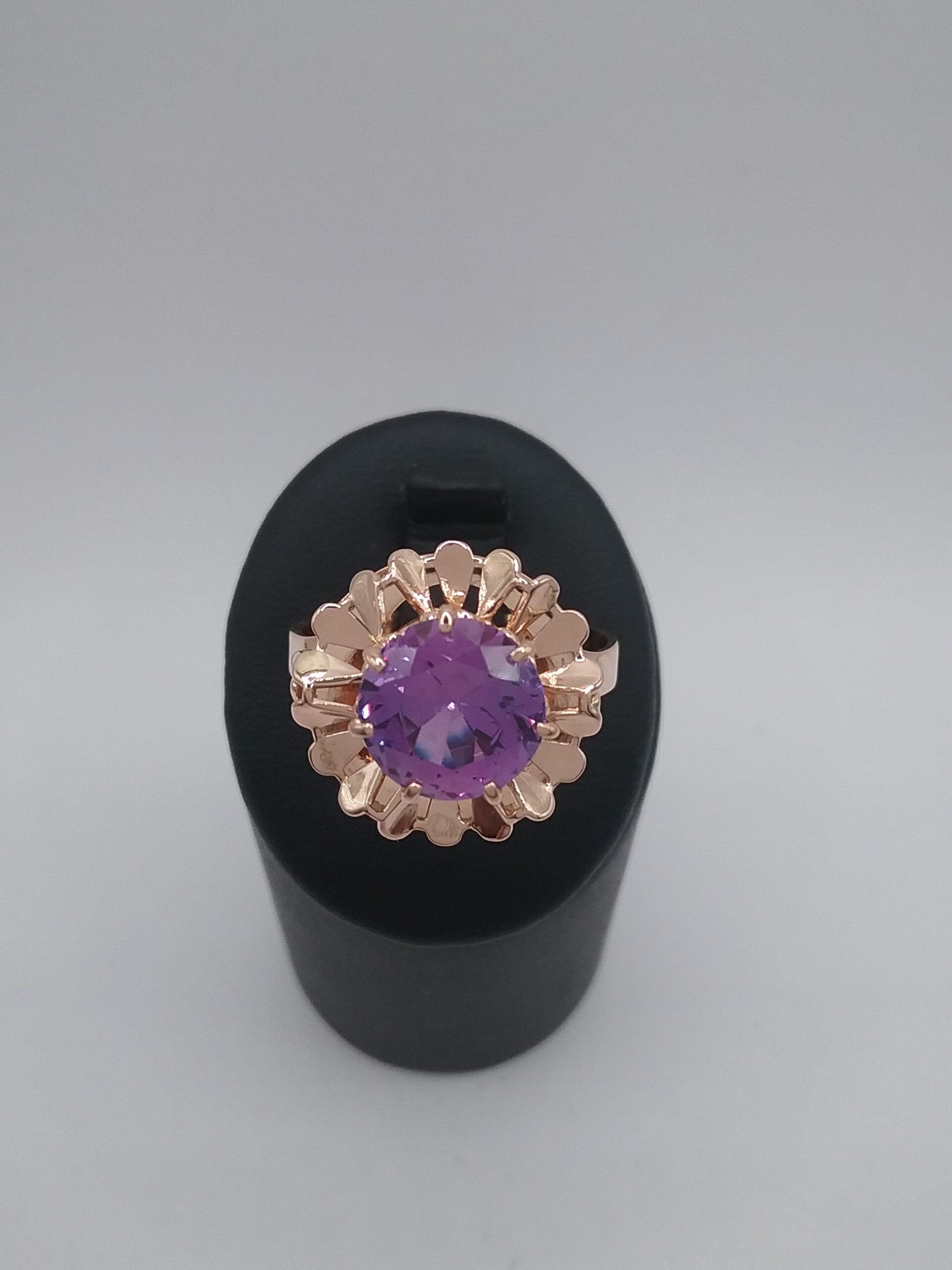 Bague en or rose 750/1000e pesant 4,25 gr sertie d’un corindon synthétique couleur améthyste