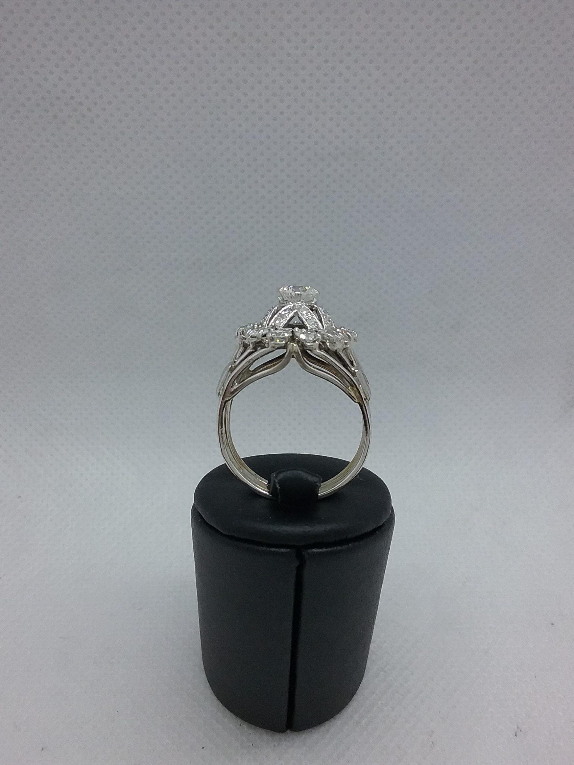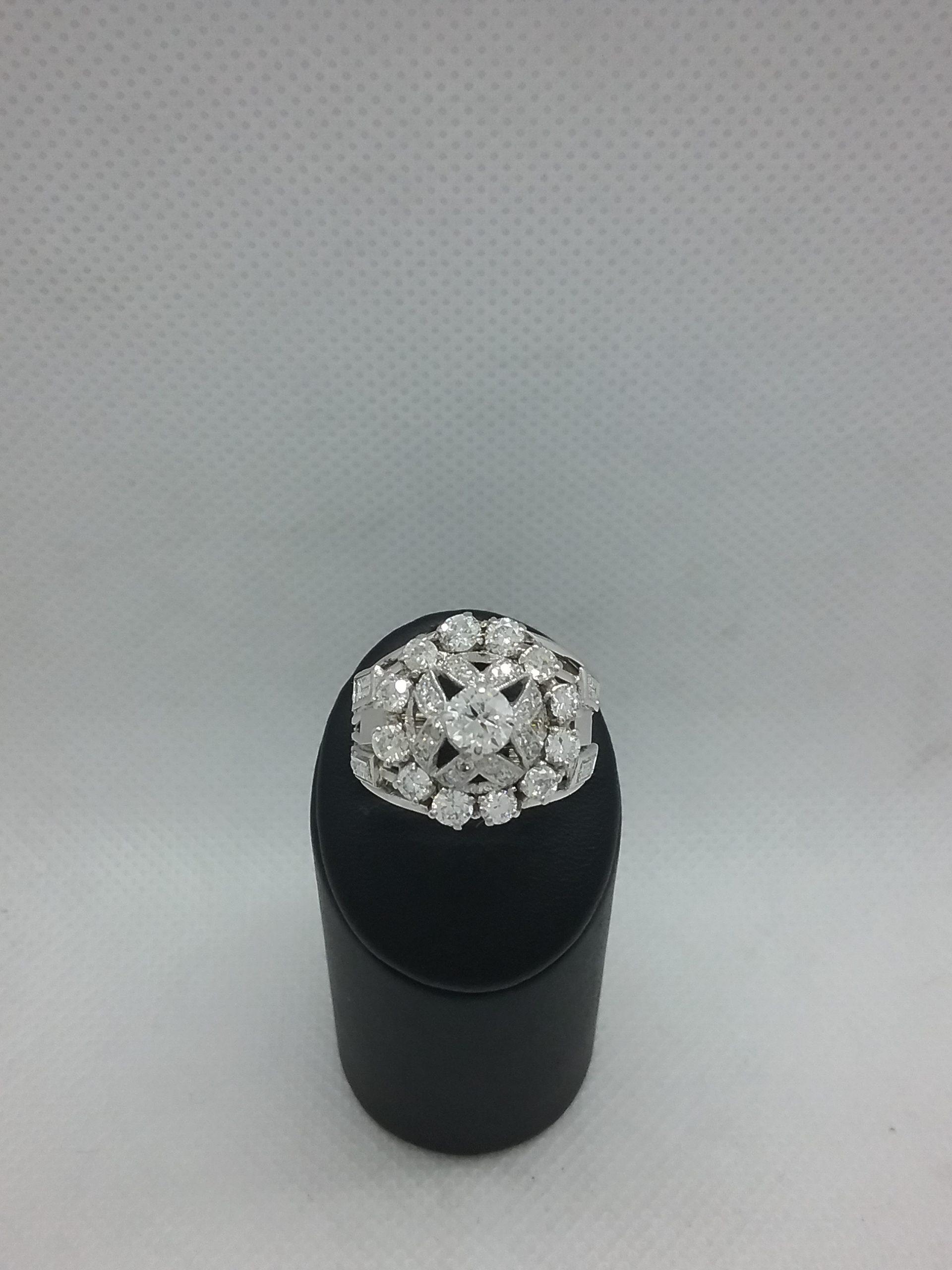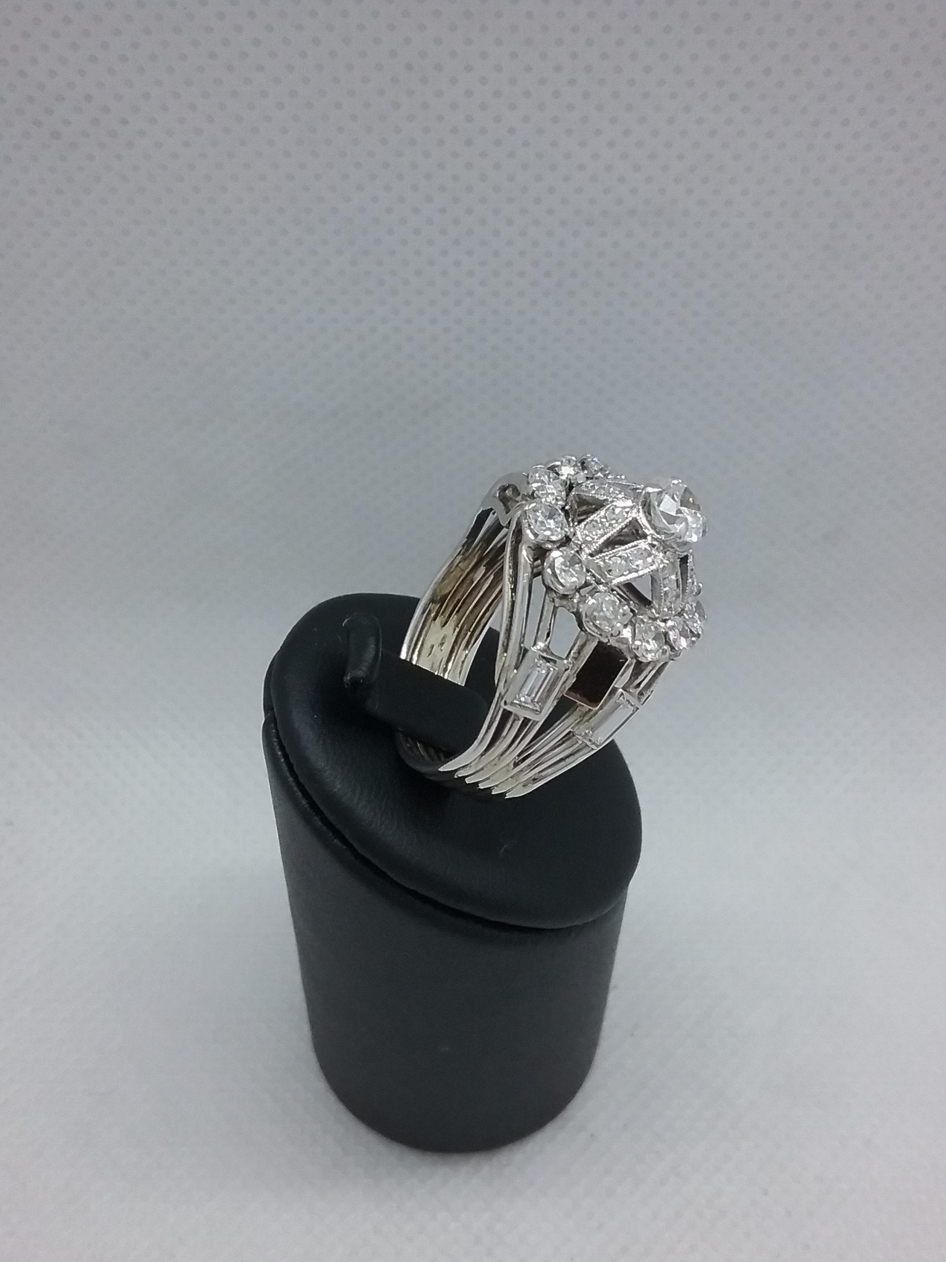 Bague en or blanc 750/1000e pesant 7,94 gr sertie d’un diamant central de 0,50 ct entourage diamants d’un poids total d’1,60 ct