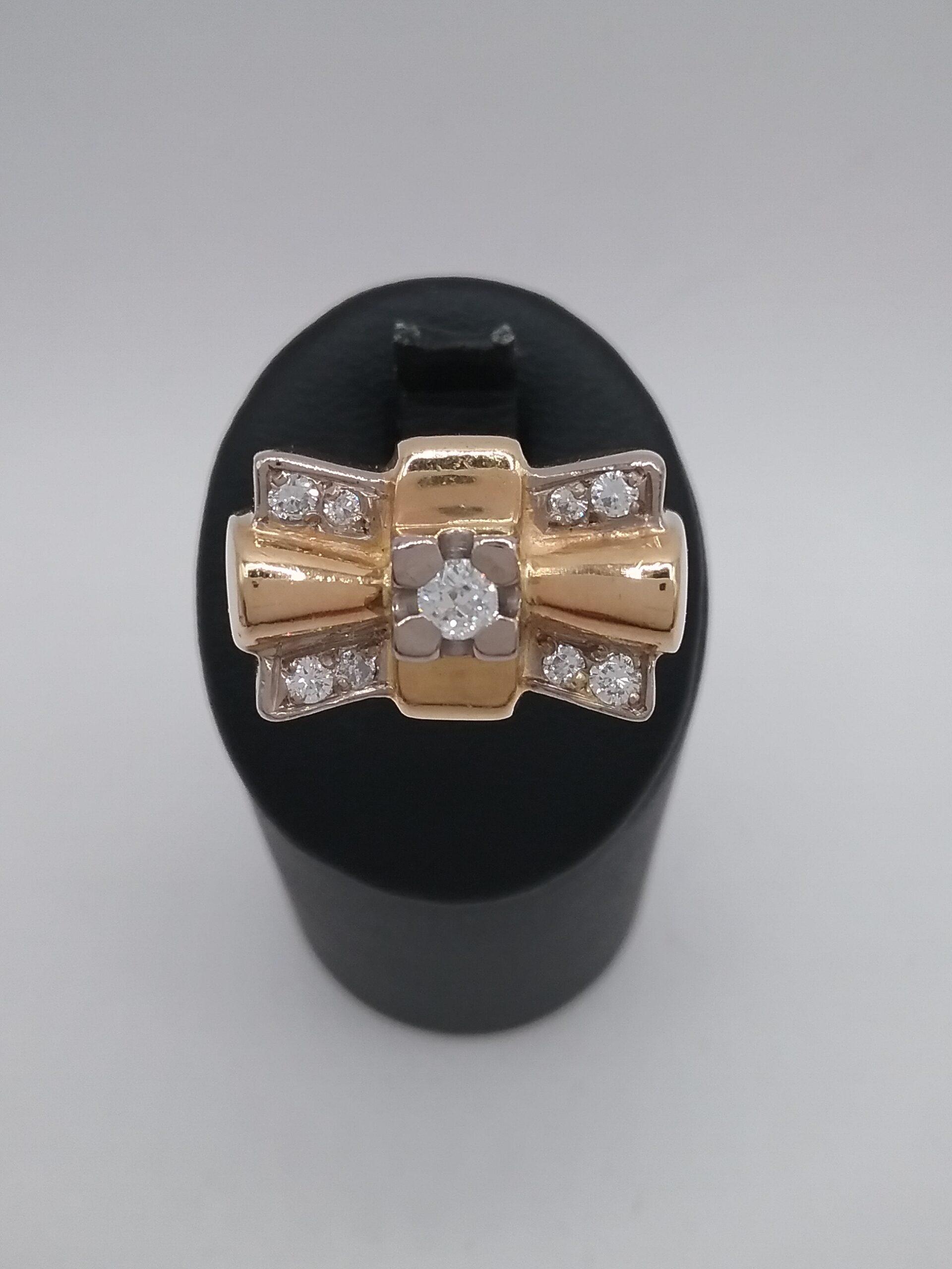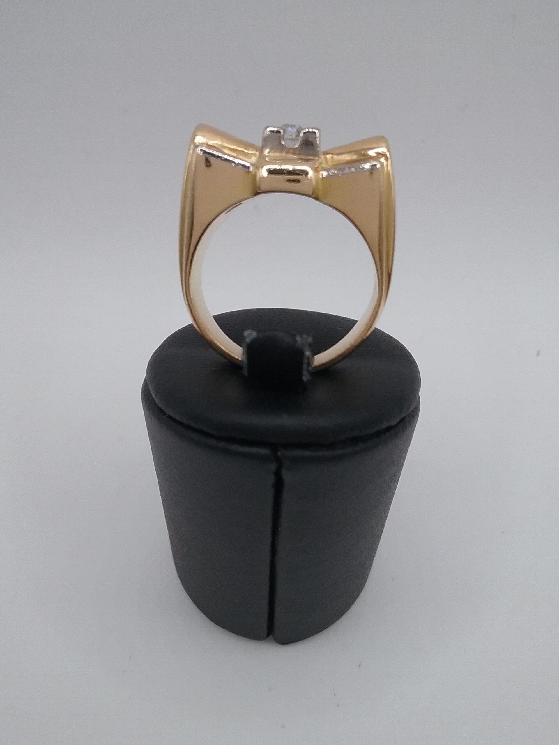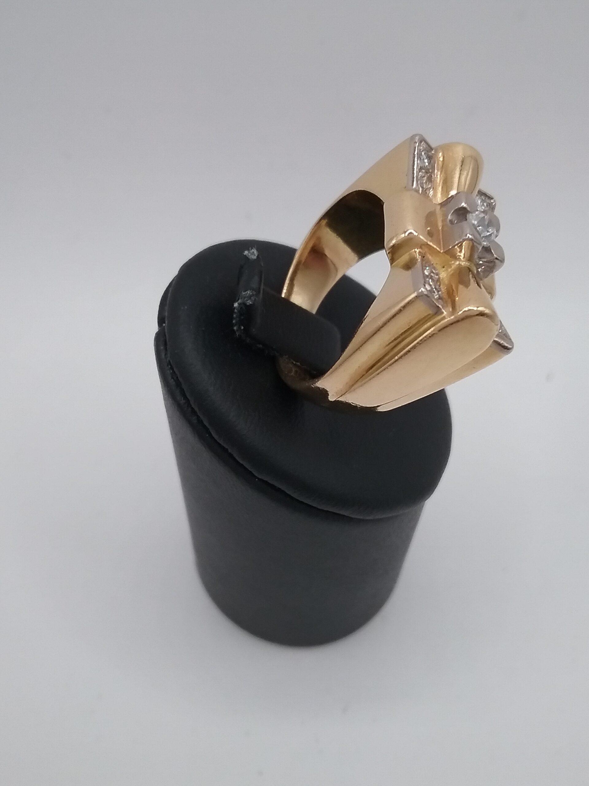 Bague en or jaune, or blanc 750/1000e pesant 18,85 gr sertie d’un diamant central de 0,11 ct et de 8 diamants d’un poids total de 0,12 ct