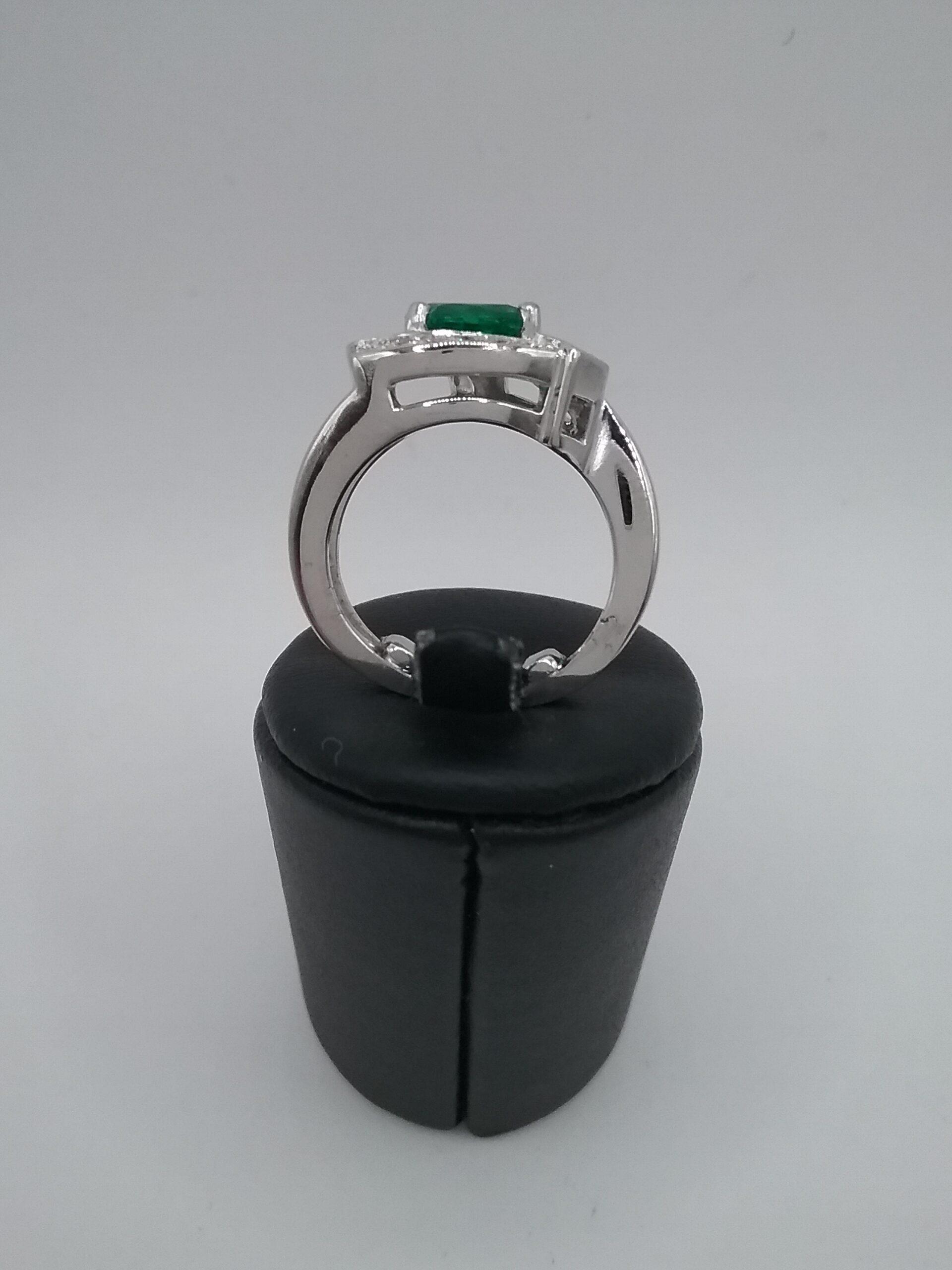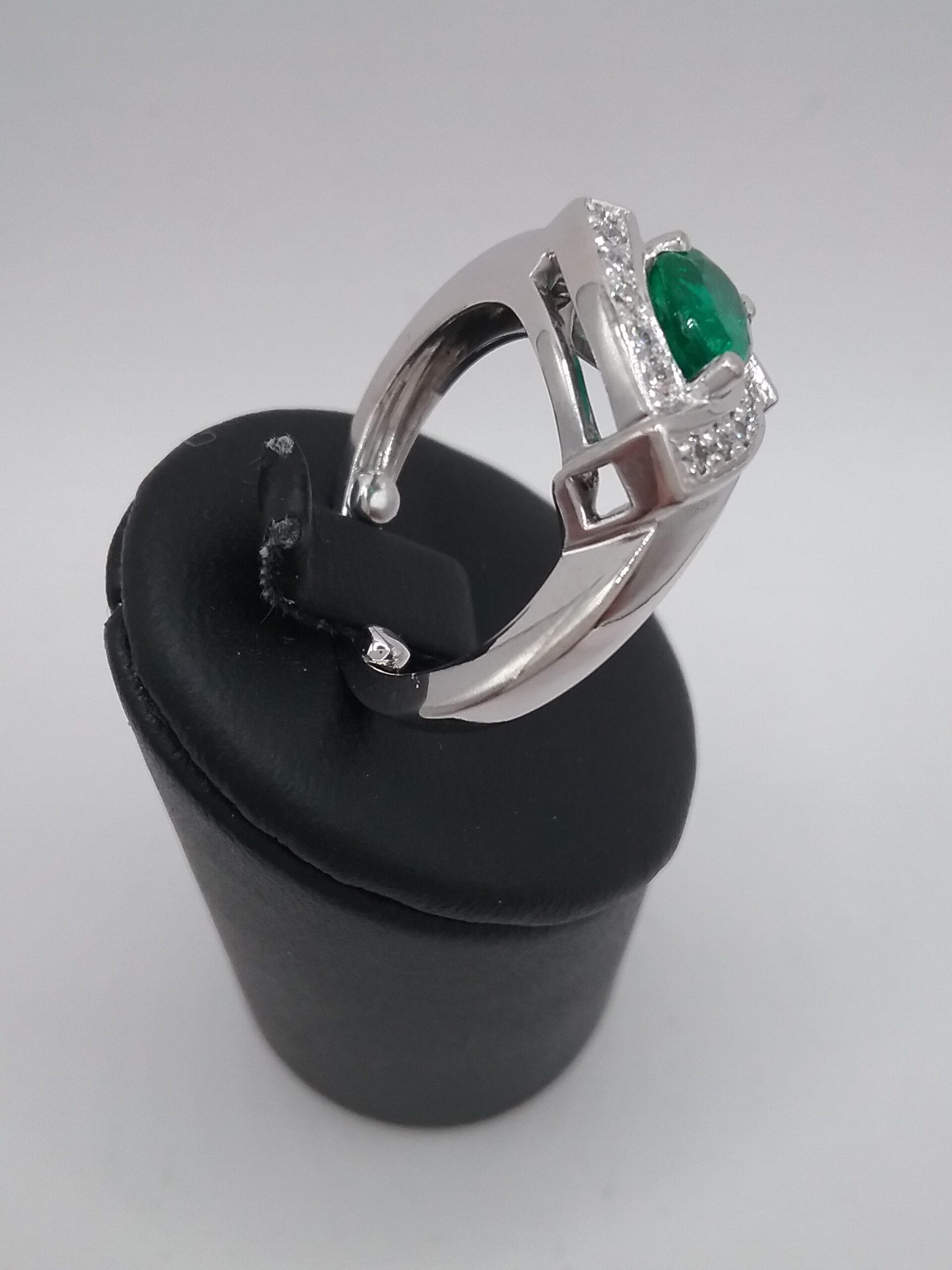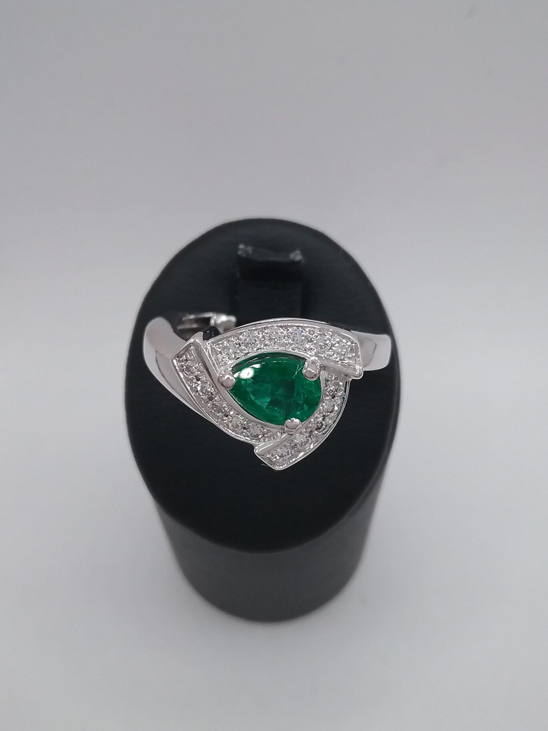 Bague en or blanc 750/1000e pesant 7 gr sertie d’une émeraude poire de 0,76 ct et diamants d’un poids total de 0,22 ct