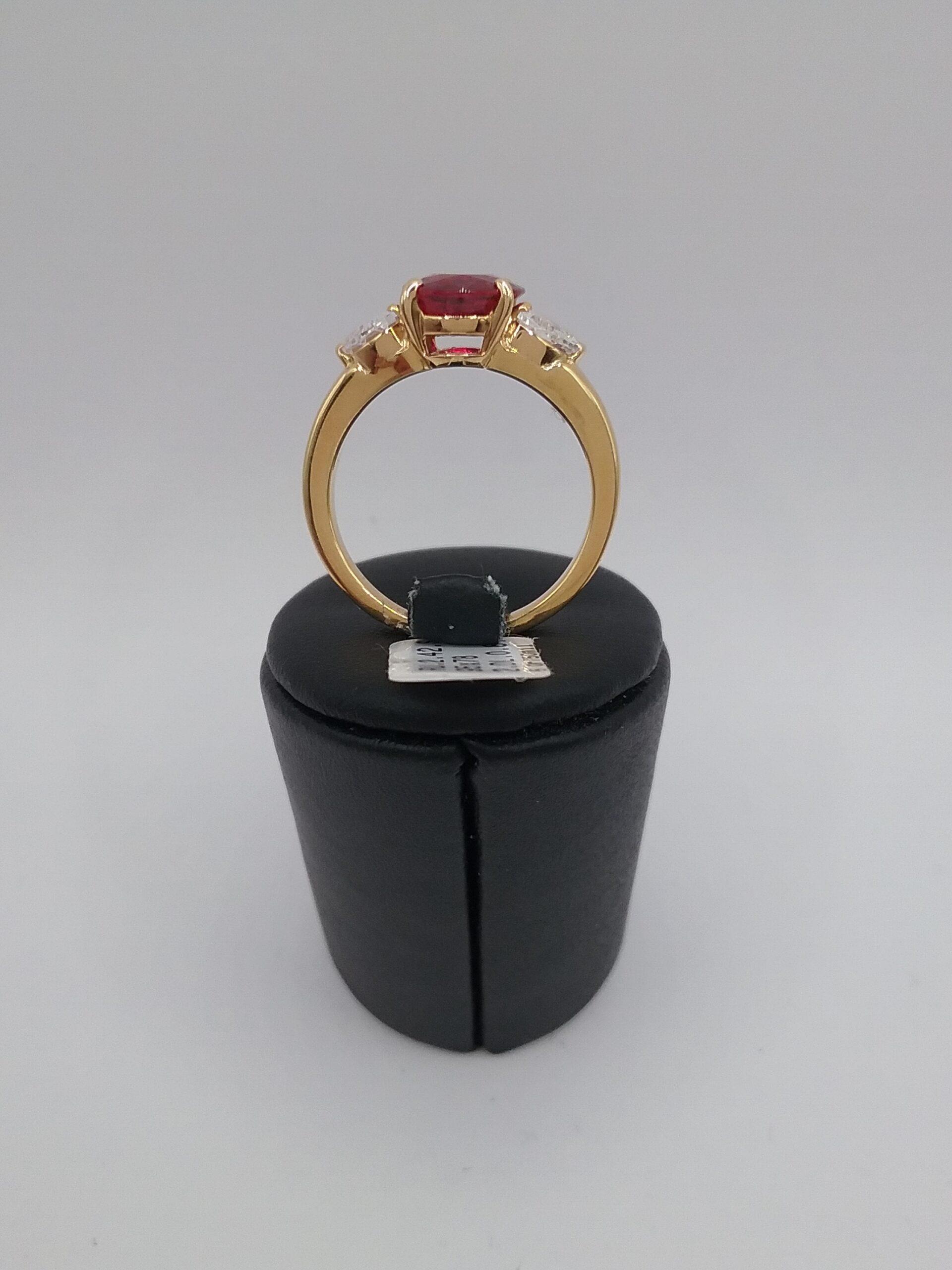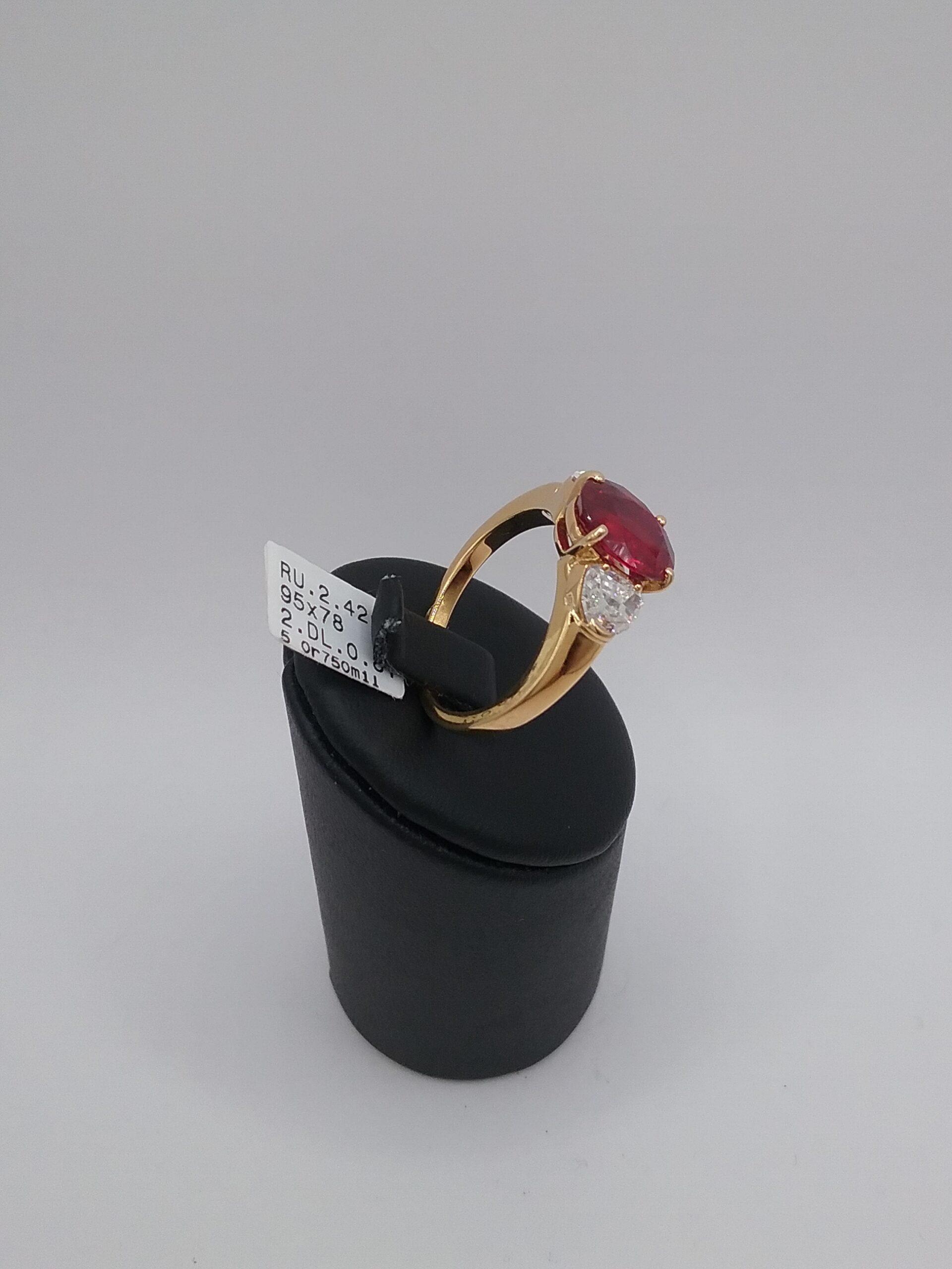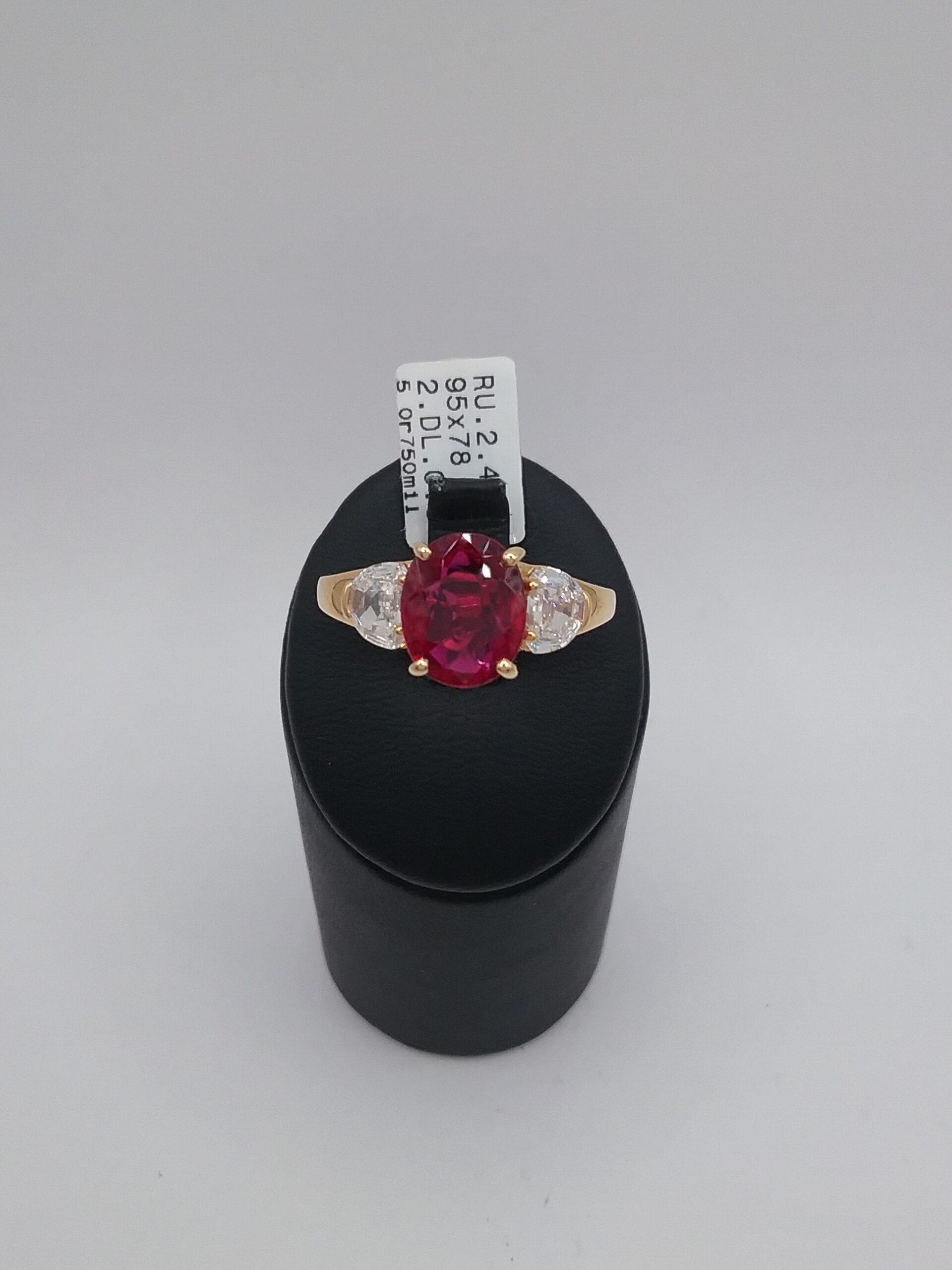 Bague en or jaune 750/1000e pesant 5 gr sertie d’un rubis de 2,42 carats et de 2 diamants demi-lune d’un poids total de 0,81 ct