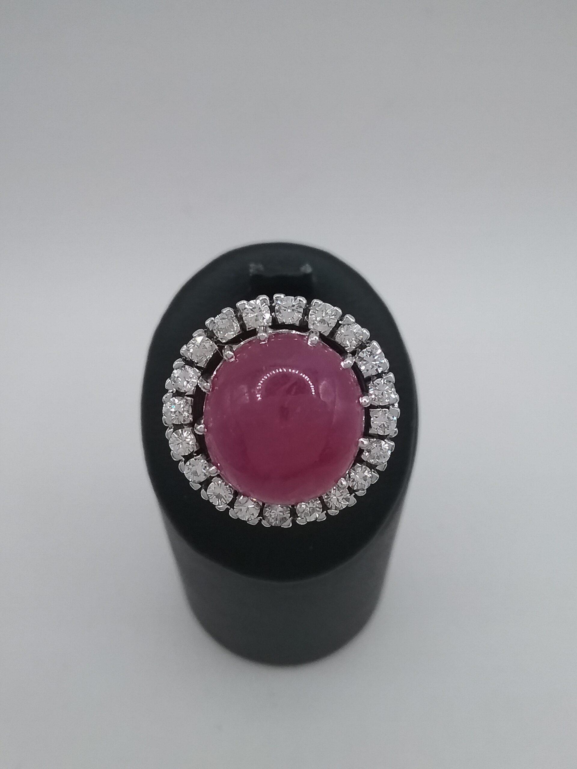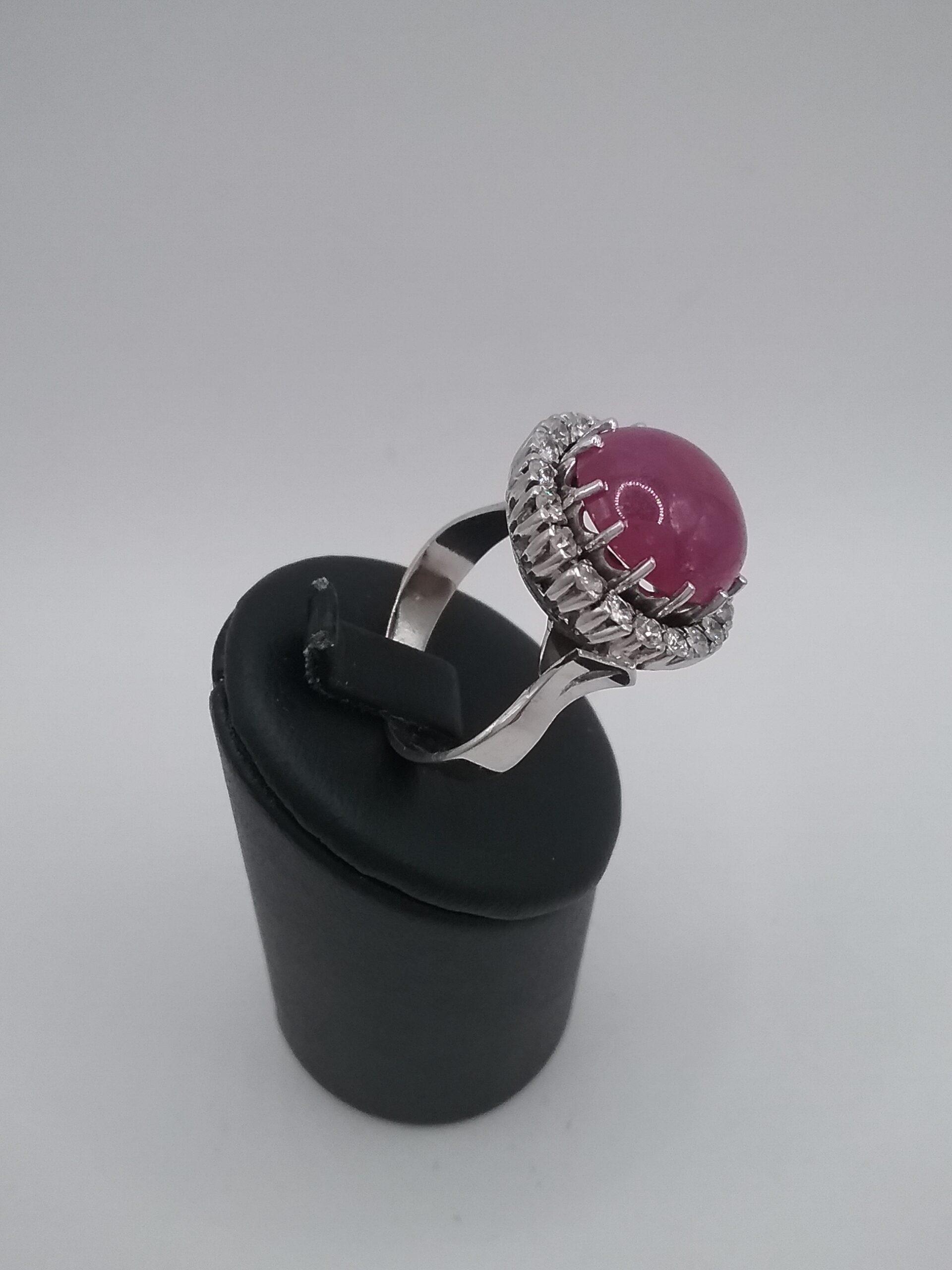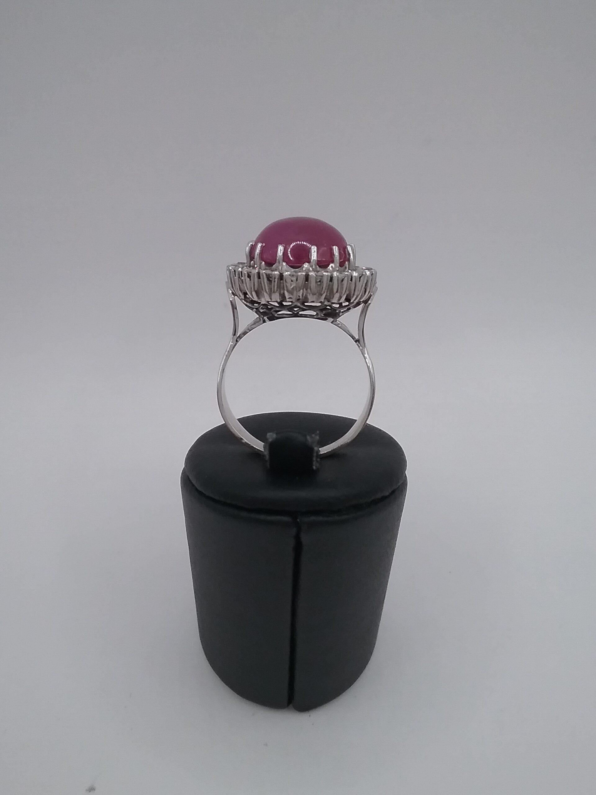 Bague en or blanc 750/1000e pesant 9,21 gr rubis cabochon de 10 carats entourage diamants d’un poids total de 0,20 ct