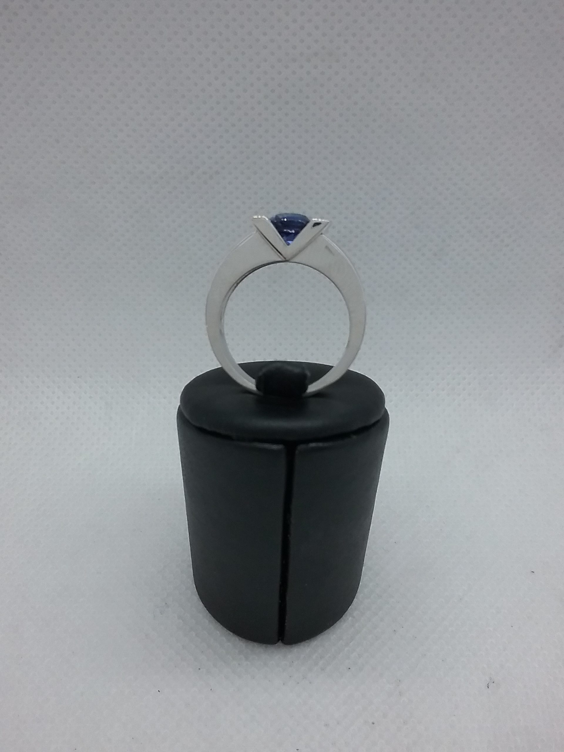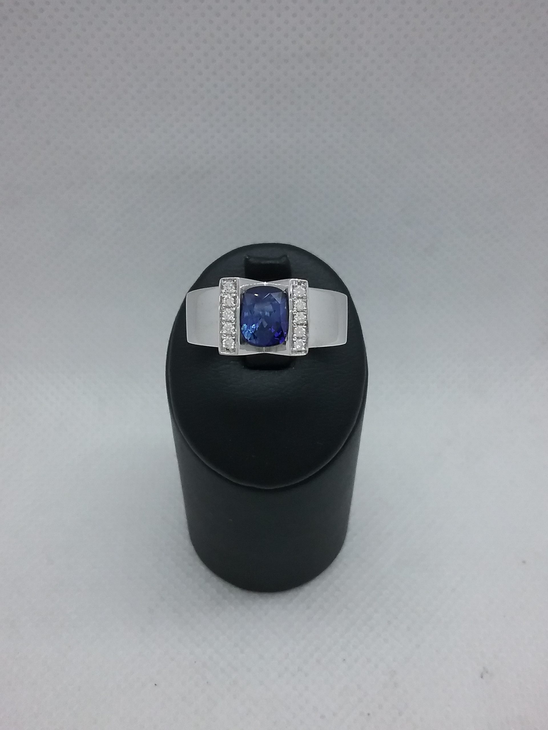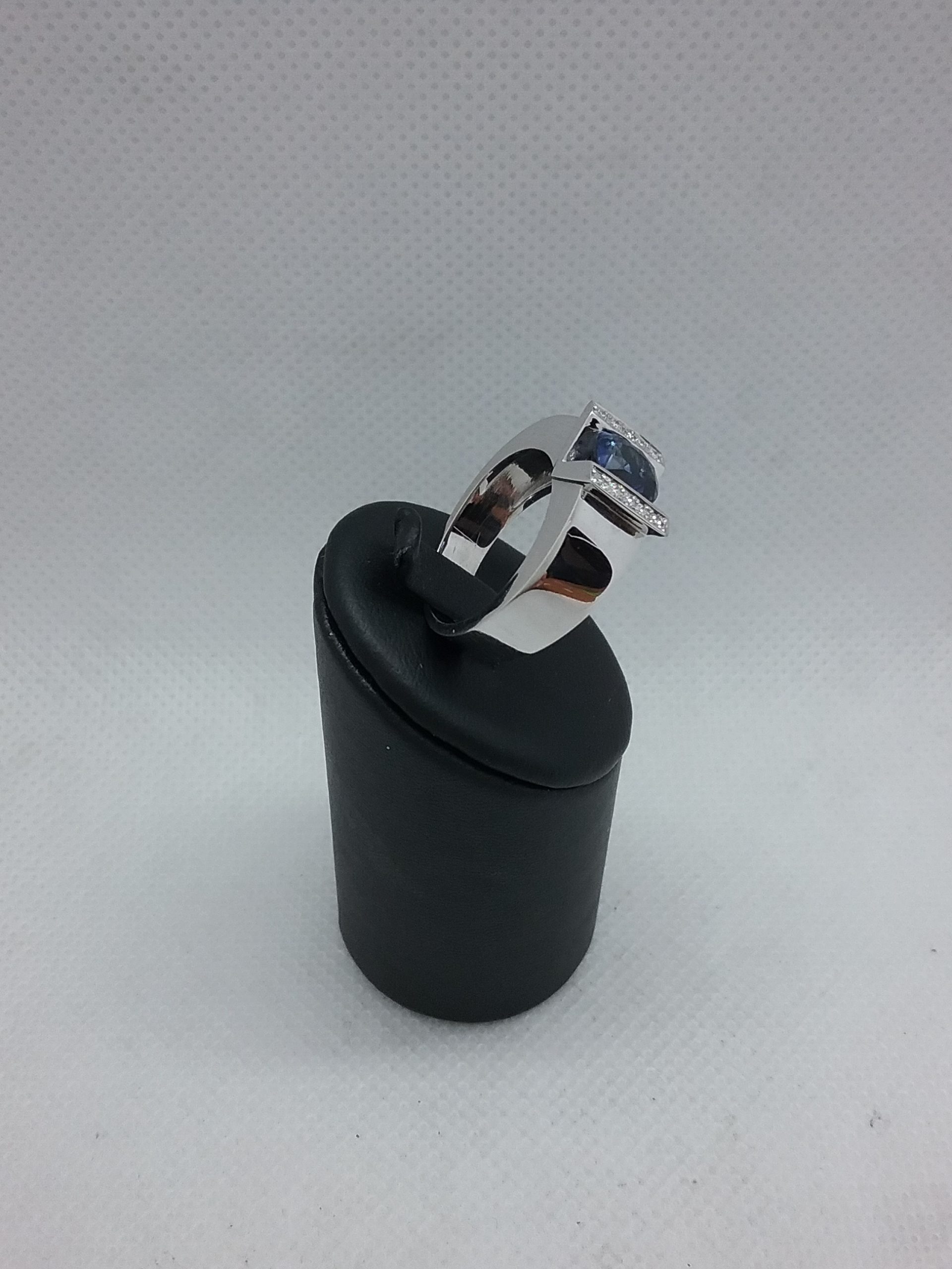 Bague en or blanc 750/1000e pesant 10,30 gr sertie d’un saphir coussin d’1,57 ct et de diamants d’un poids total de 0,10 ct