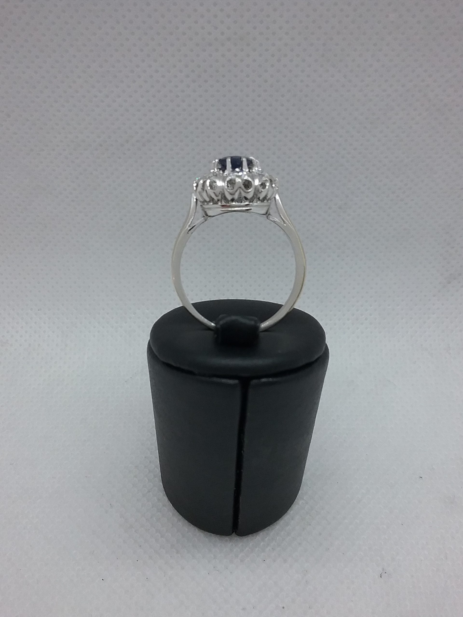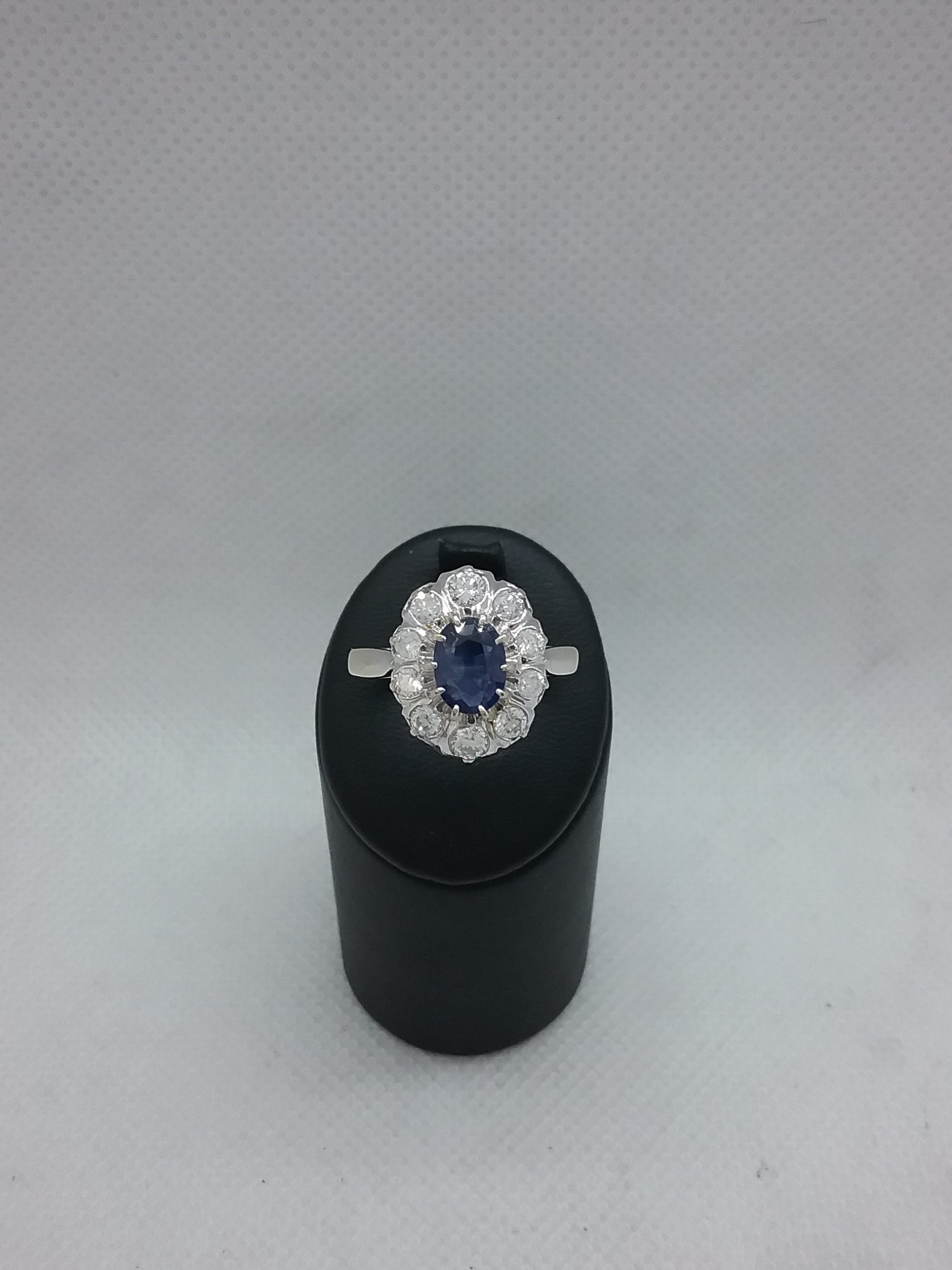Bague pompadour en or blanc 750/1000e pesant 5,83 gr sertie d’un saphir d’1 carat entourage diamants d’un poids total de 0,70 ct