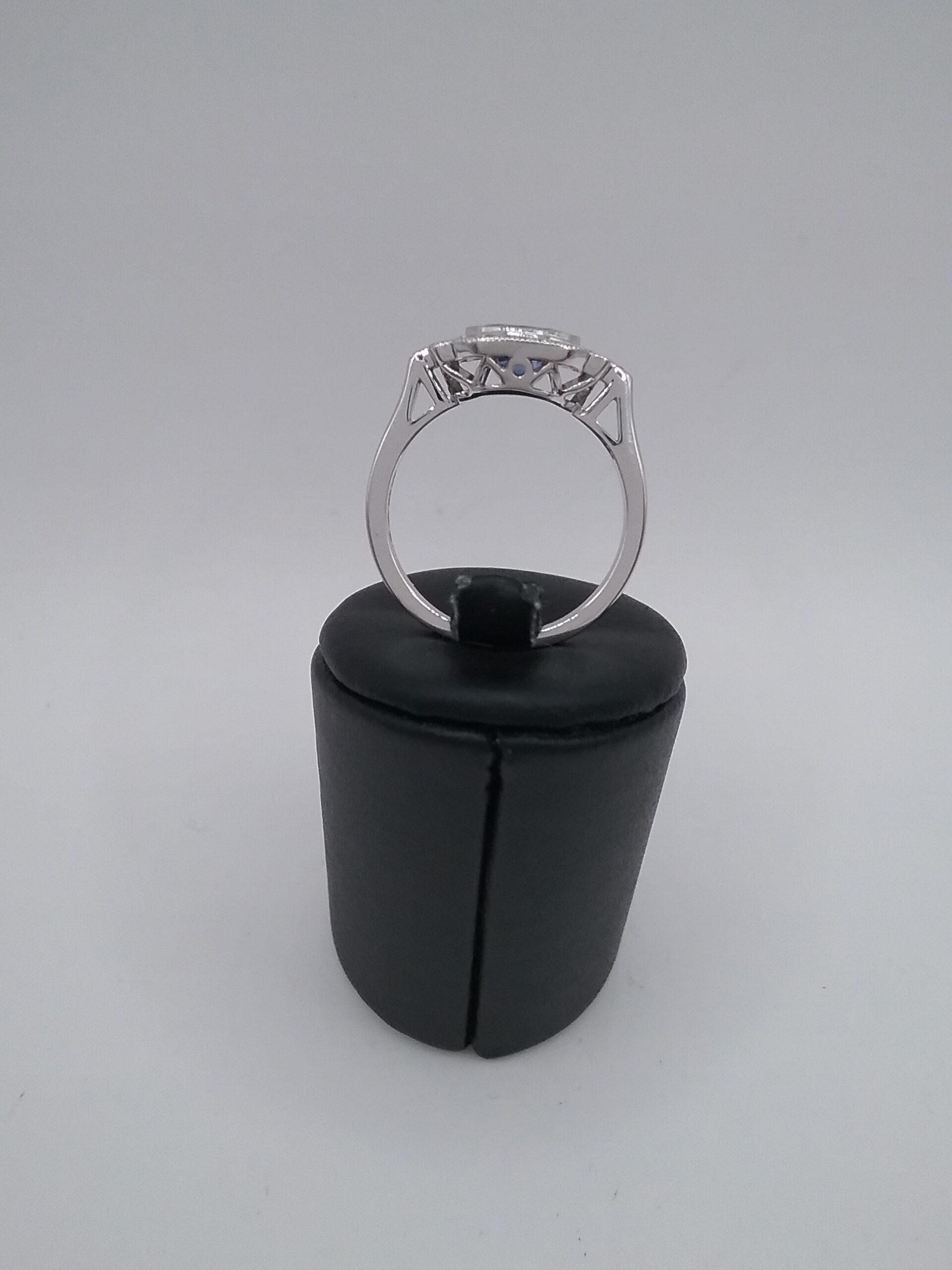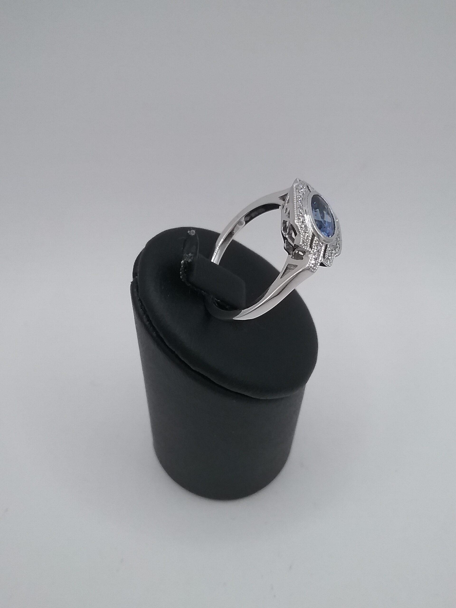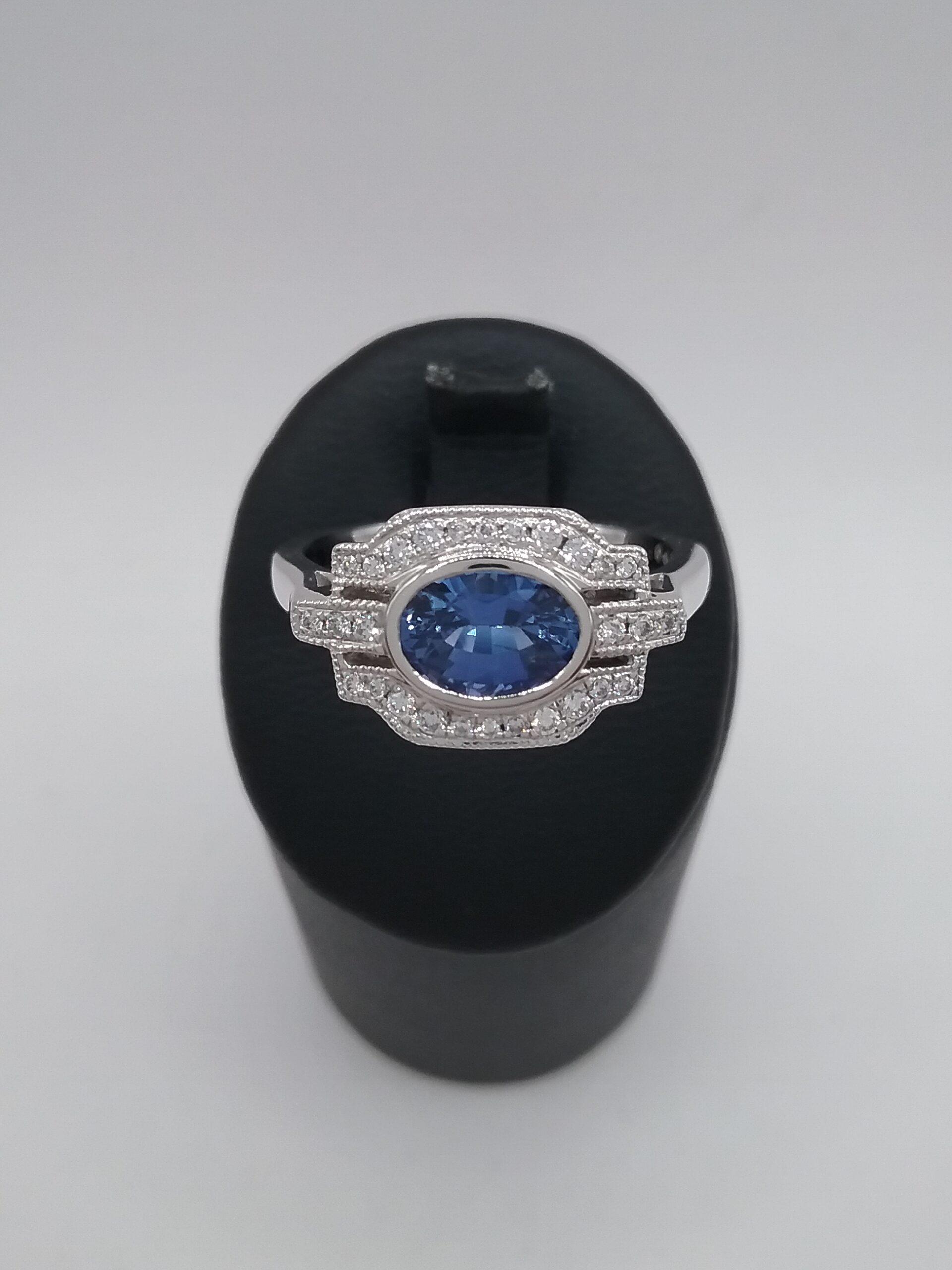 Bague en platine pesant 5,68 gr sertie d’un saphir ovale d’ 1 07 carat et de diamants d’un poids total de 0,14 ct