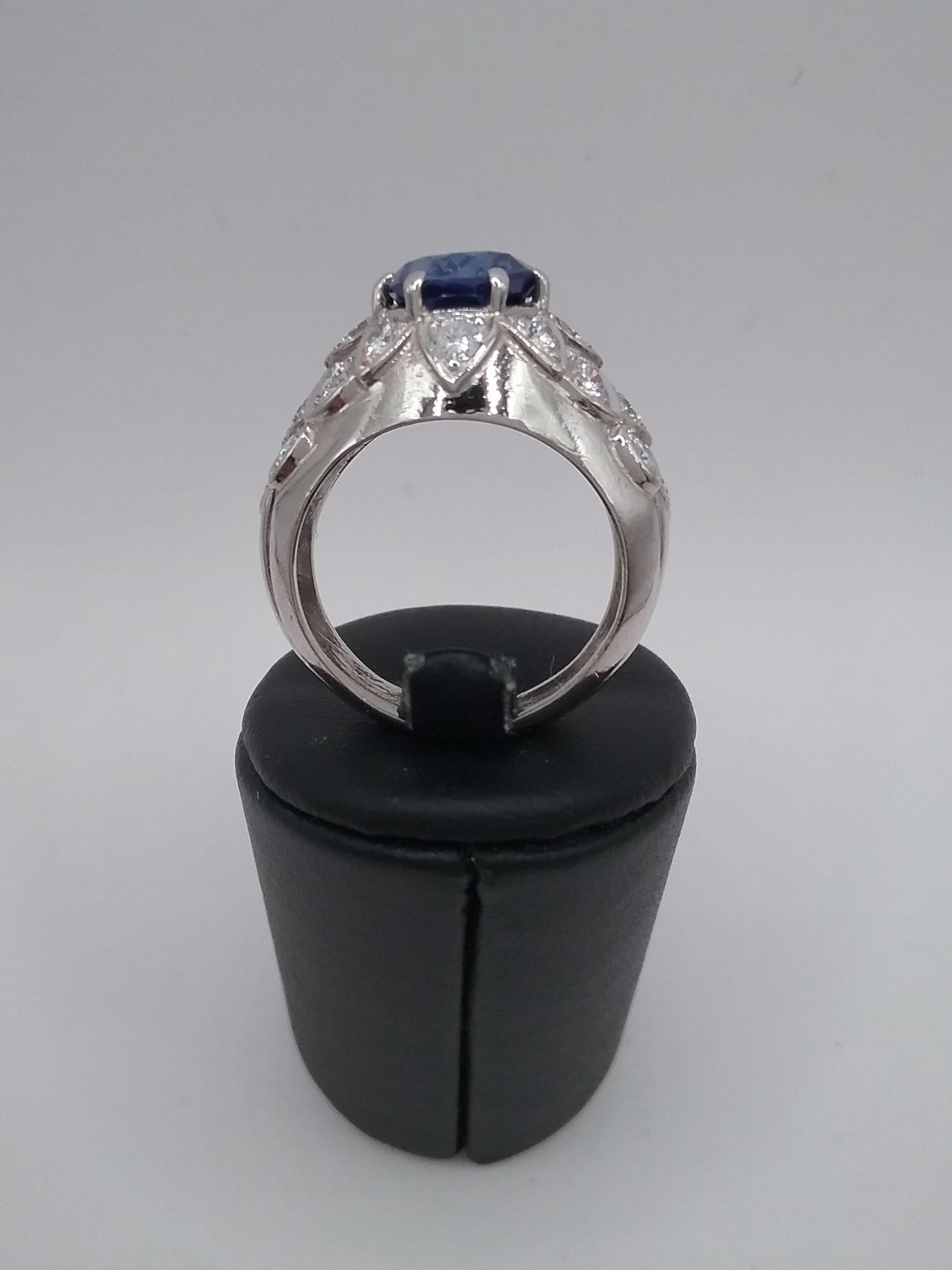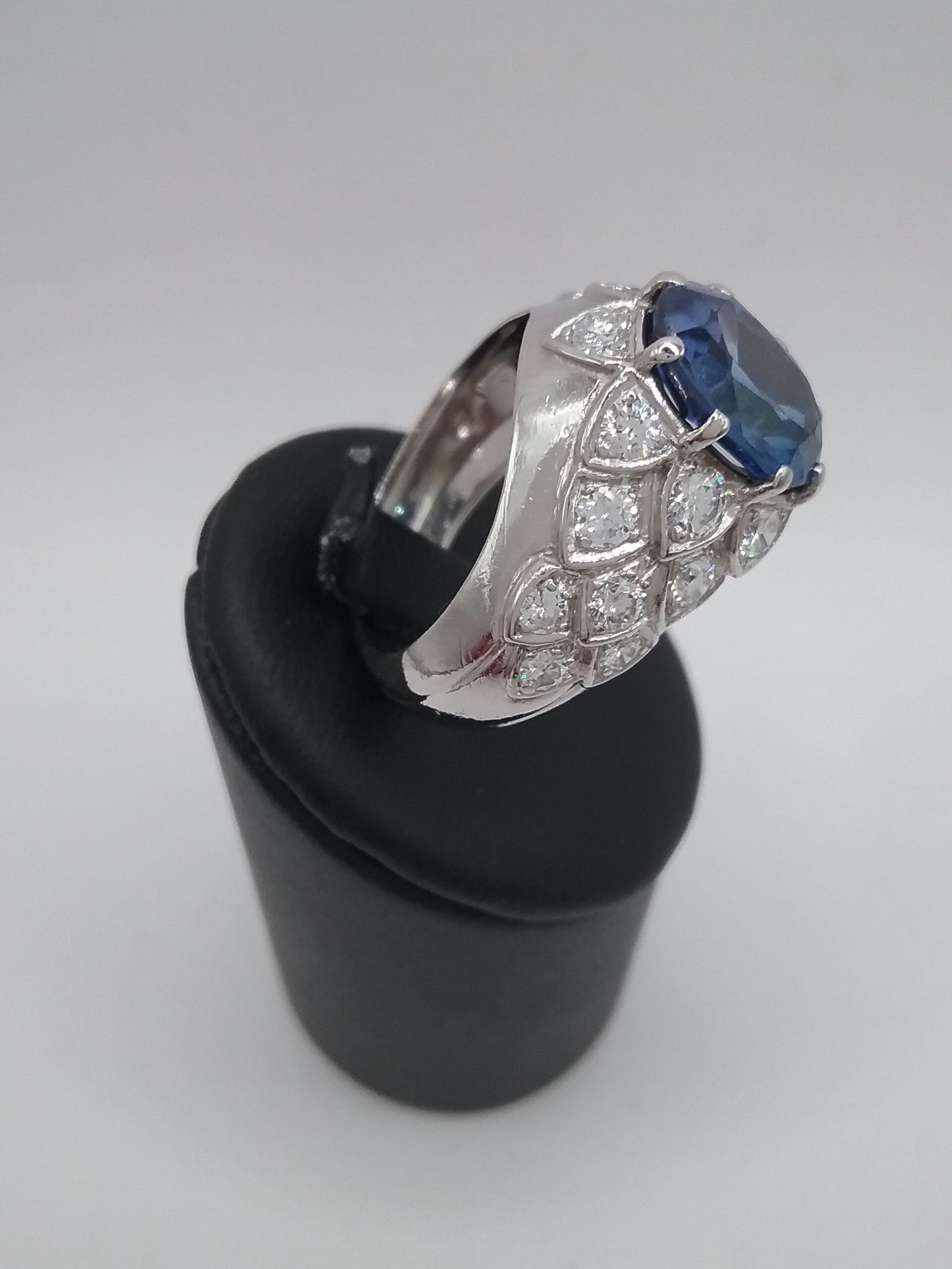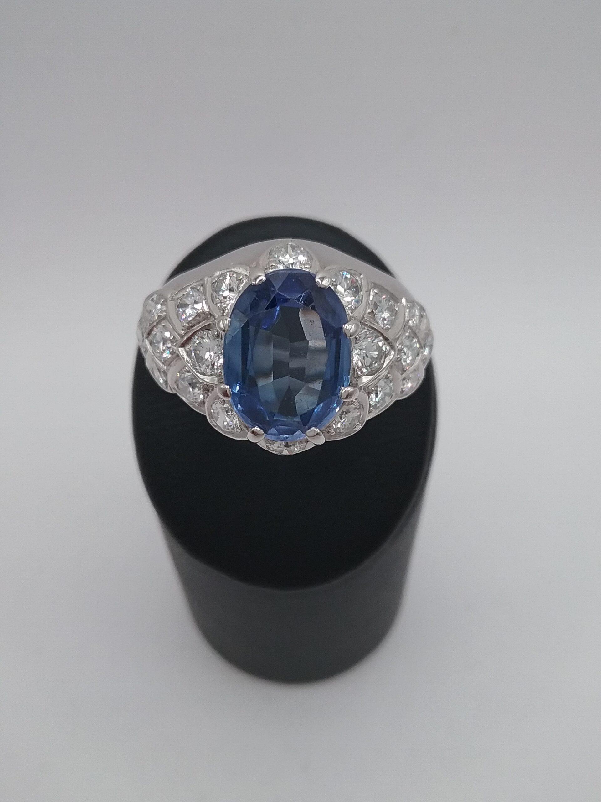 Bague jonc en platine pesant 10,50 gr sertie d’un saphir ovale de 4,50 carats et de 20 diamants d’un poids total d’ 1 carat