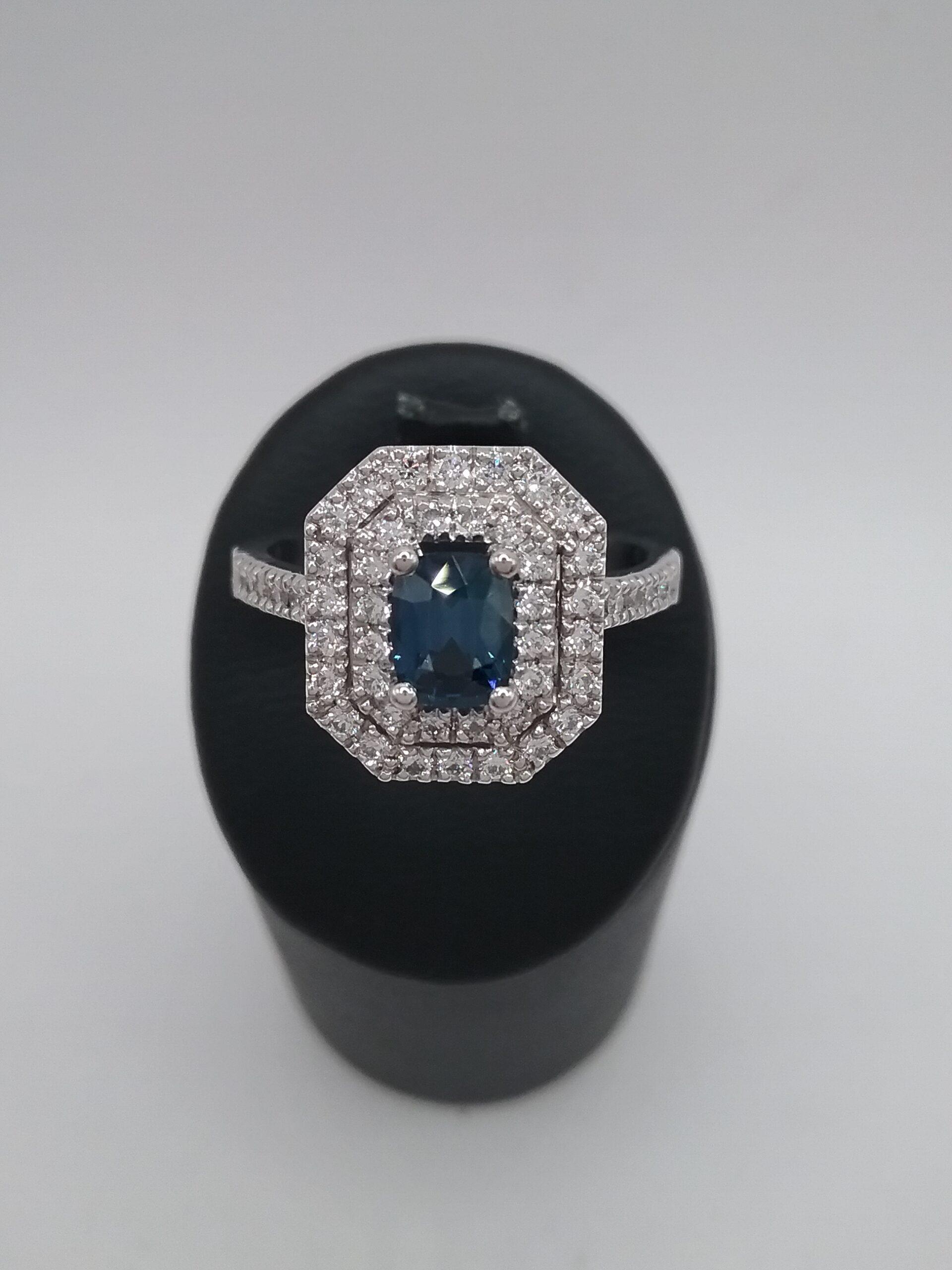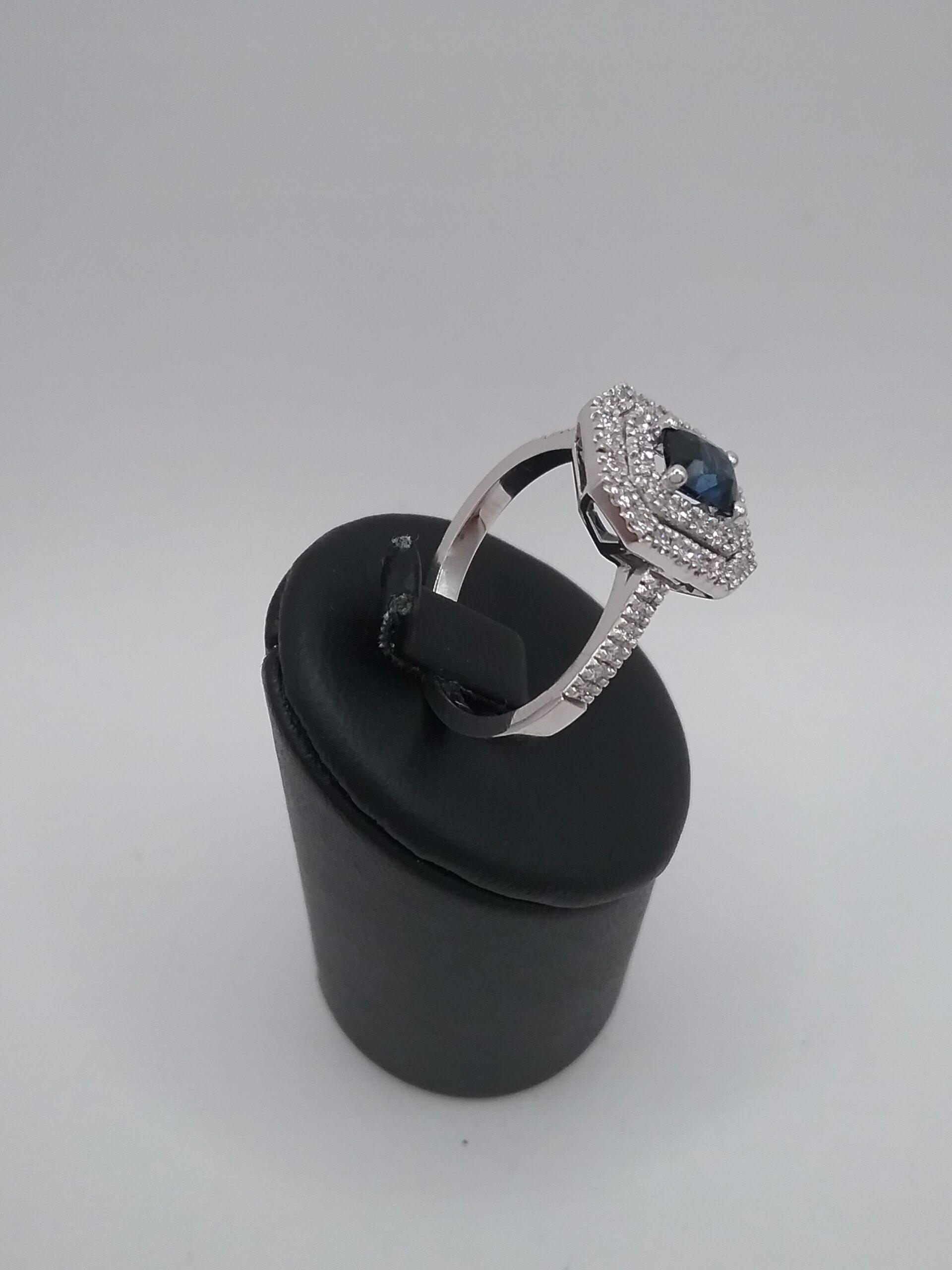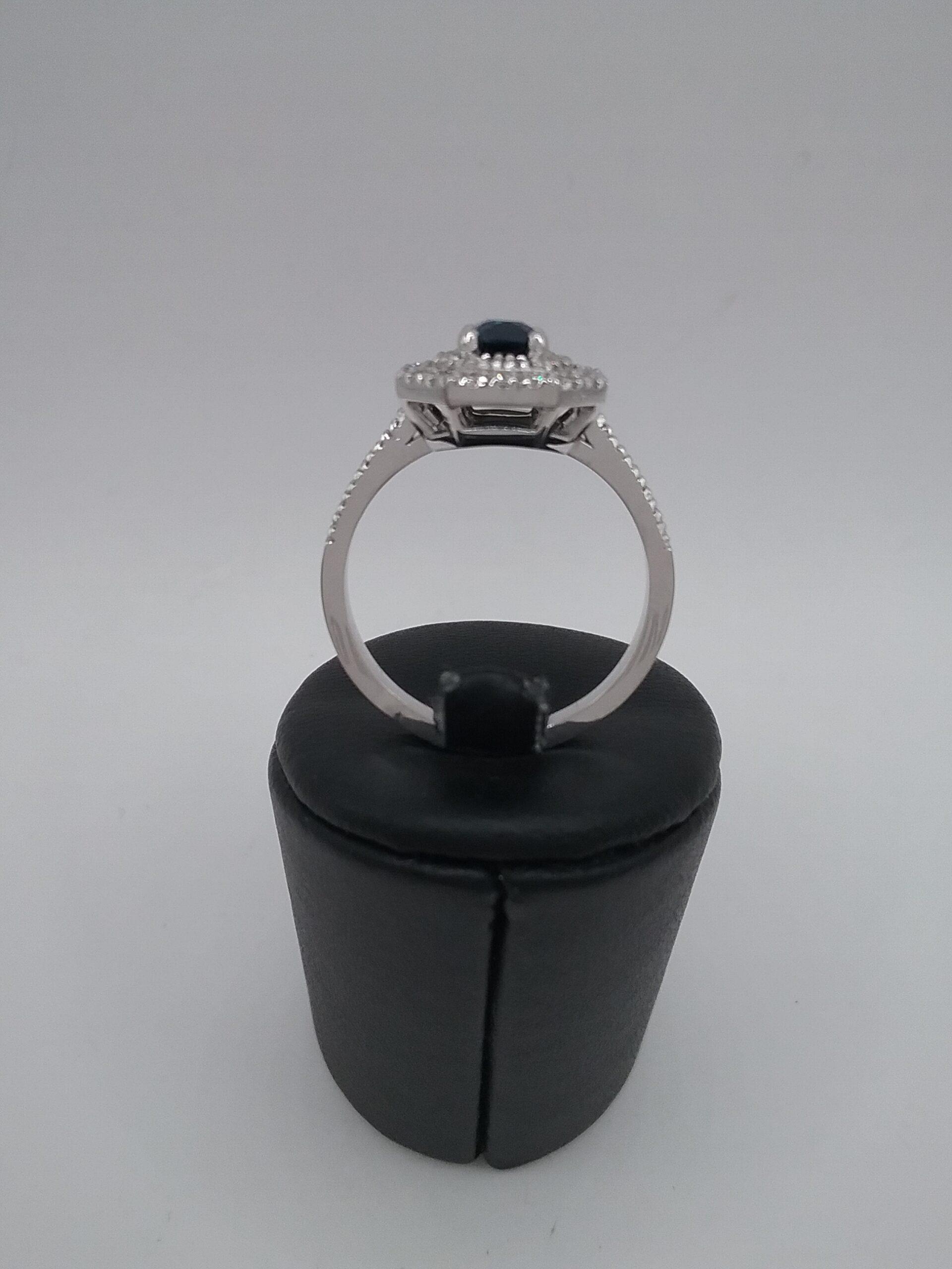 Bague en or blanc 750/1000e pesant 5,35 gr sertie d’un saphir rectangulaire pans coupés de 0,67 ct double entourage diamants d’un poids total de 0,47 ct