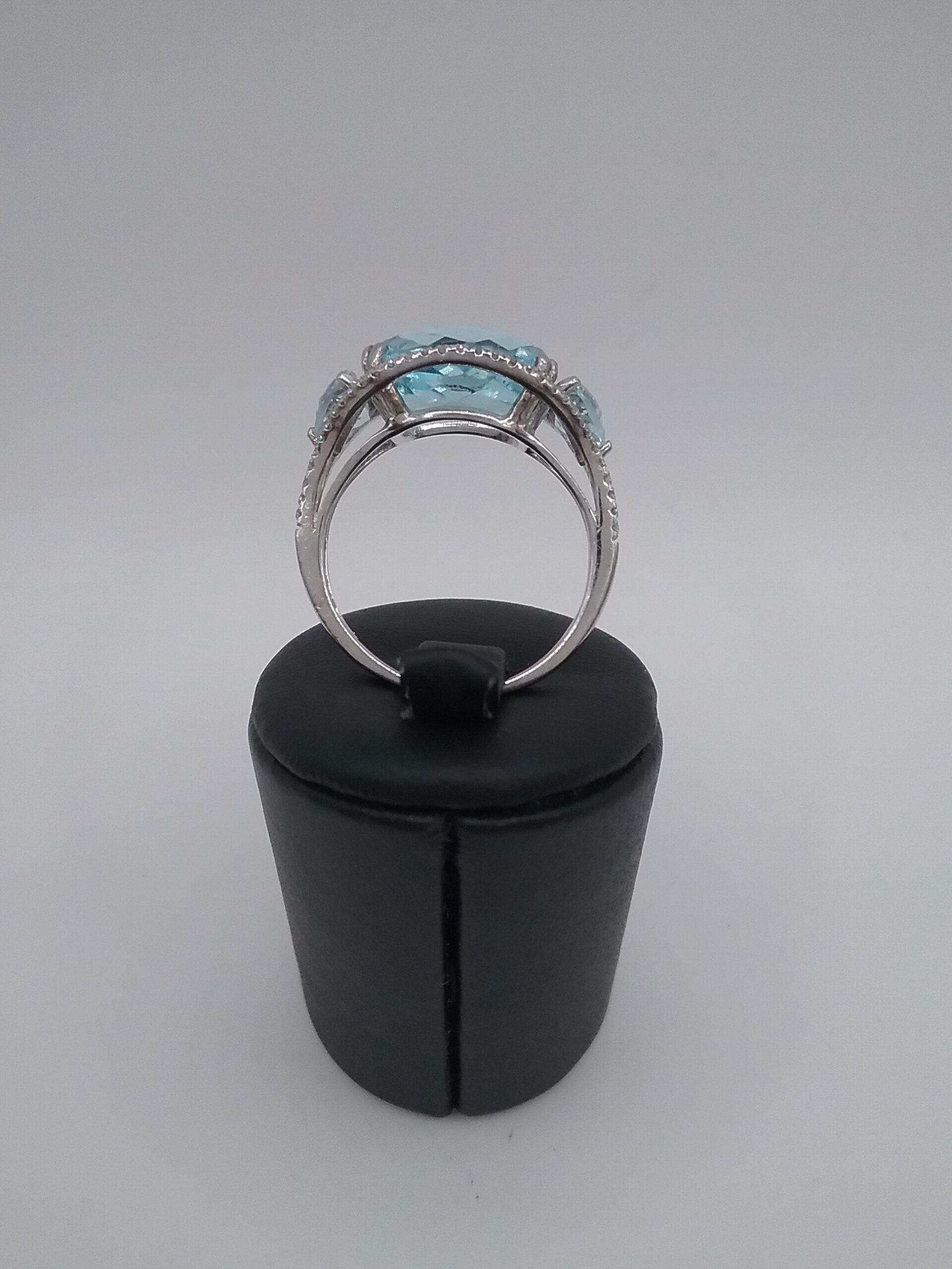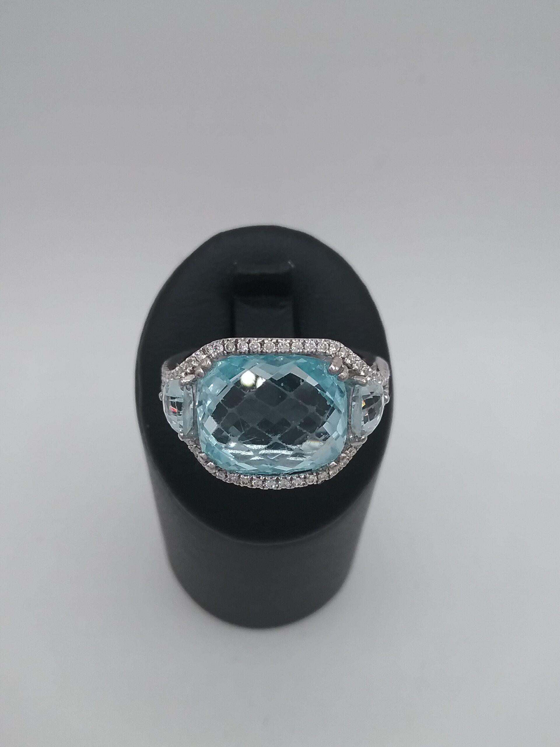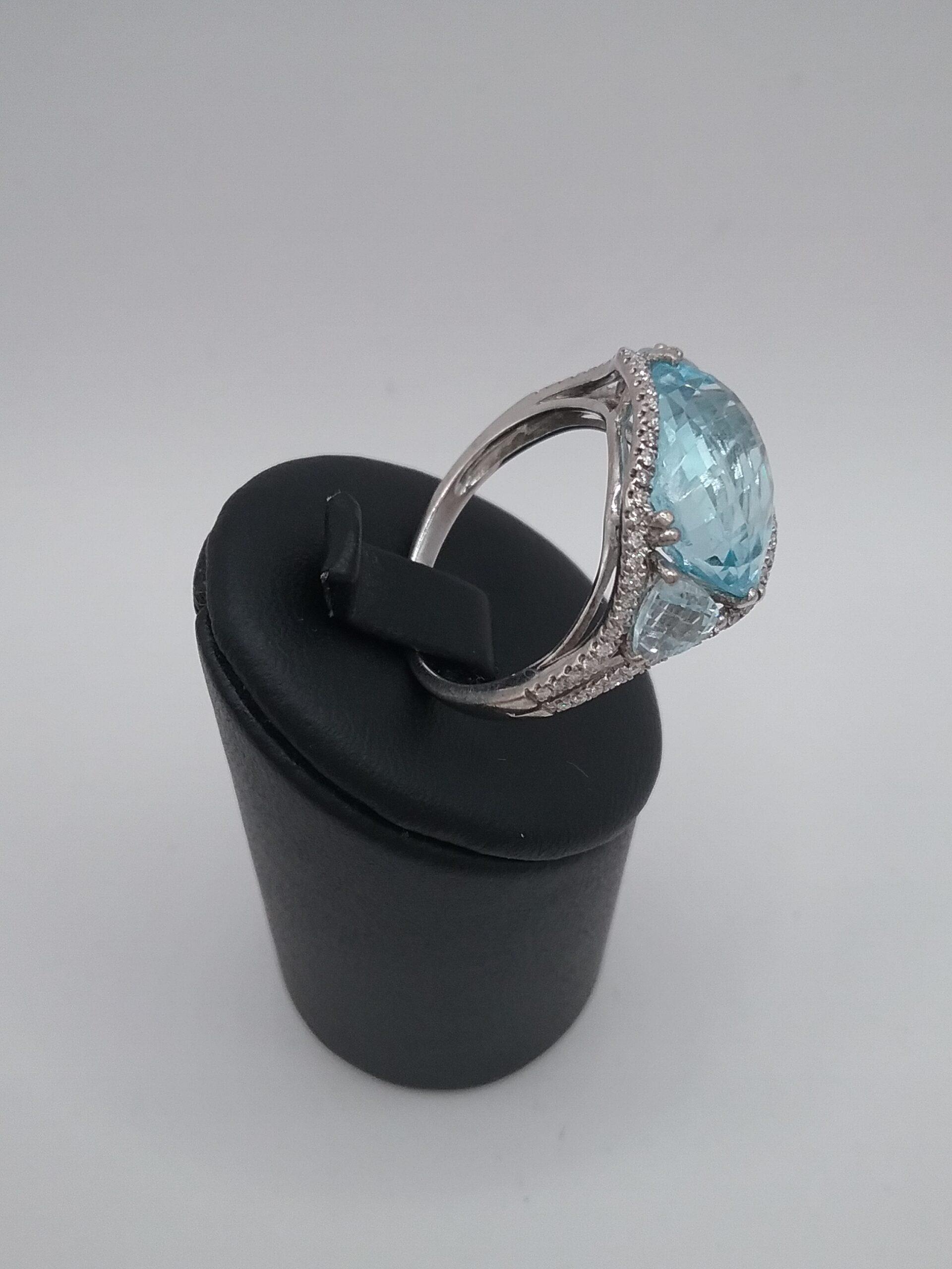 Bague en or blanc 750/1000e pesant 5,37 gr sertie d’une topaze bleue facettée de 10 carats et de diamants d’un poids total de 0,30 ct