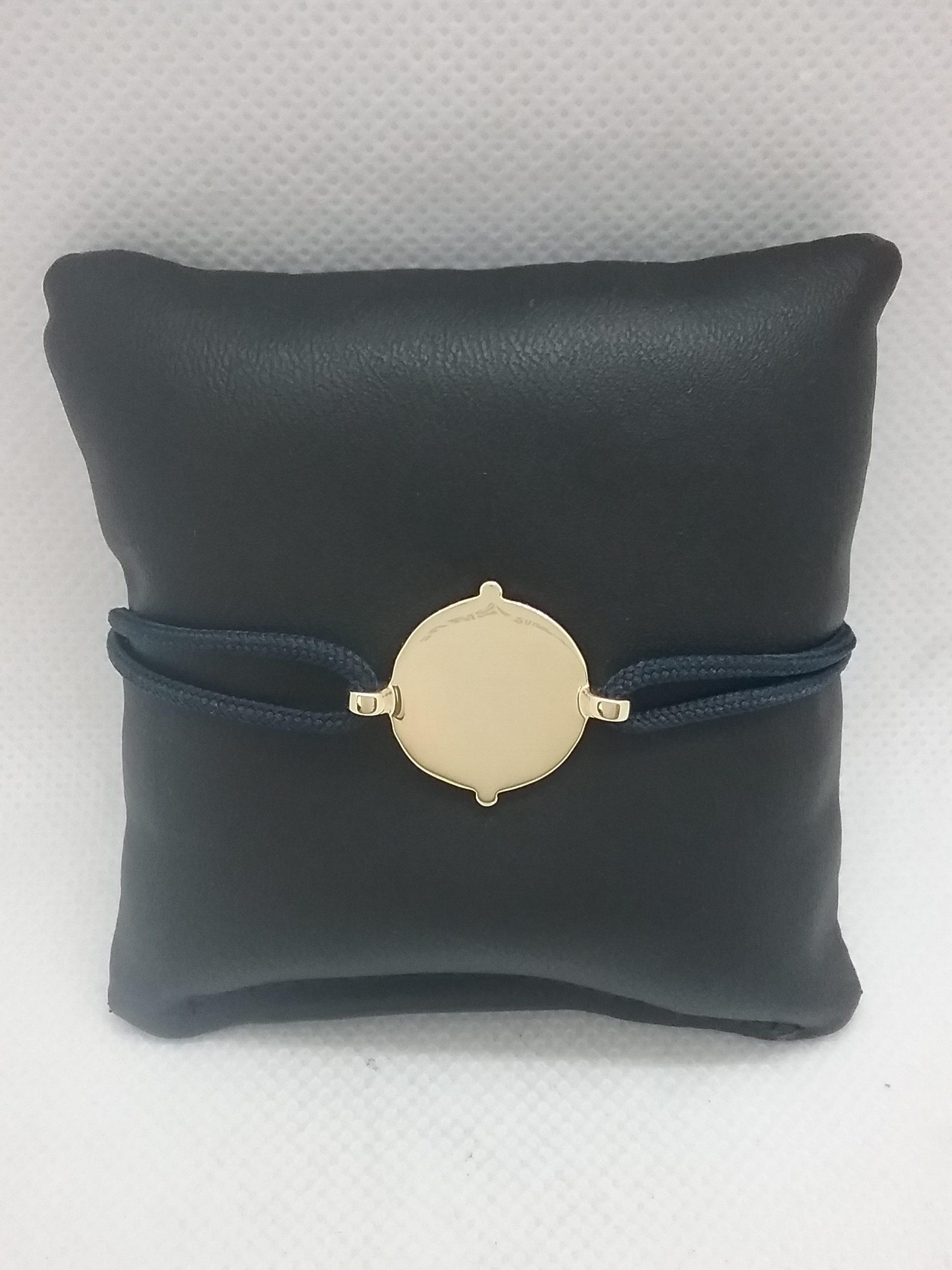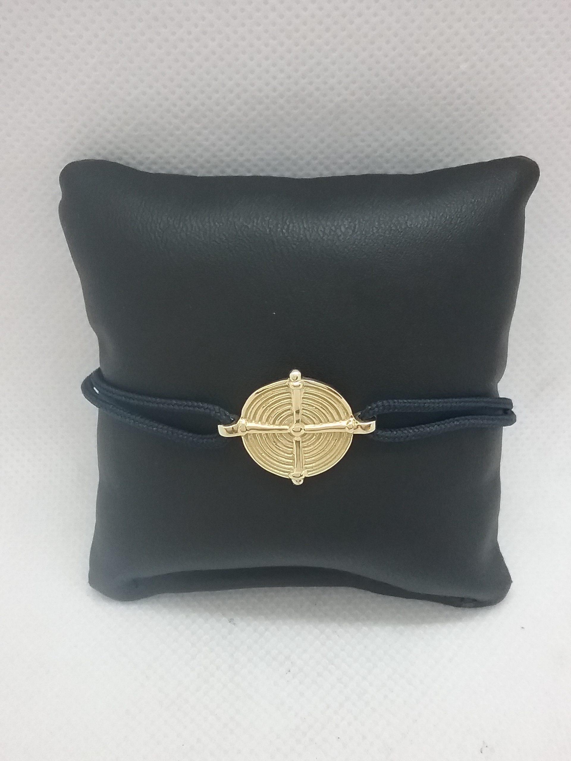 Bracelet cordon marine avec plaque en or jaune 750/1000e pesant 3,20 gr motif « disque africain »