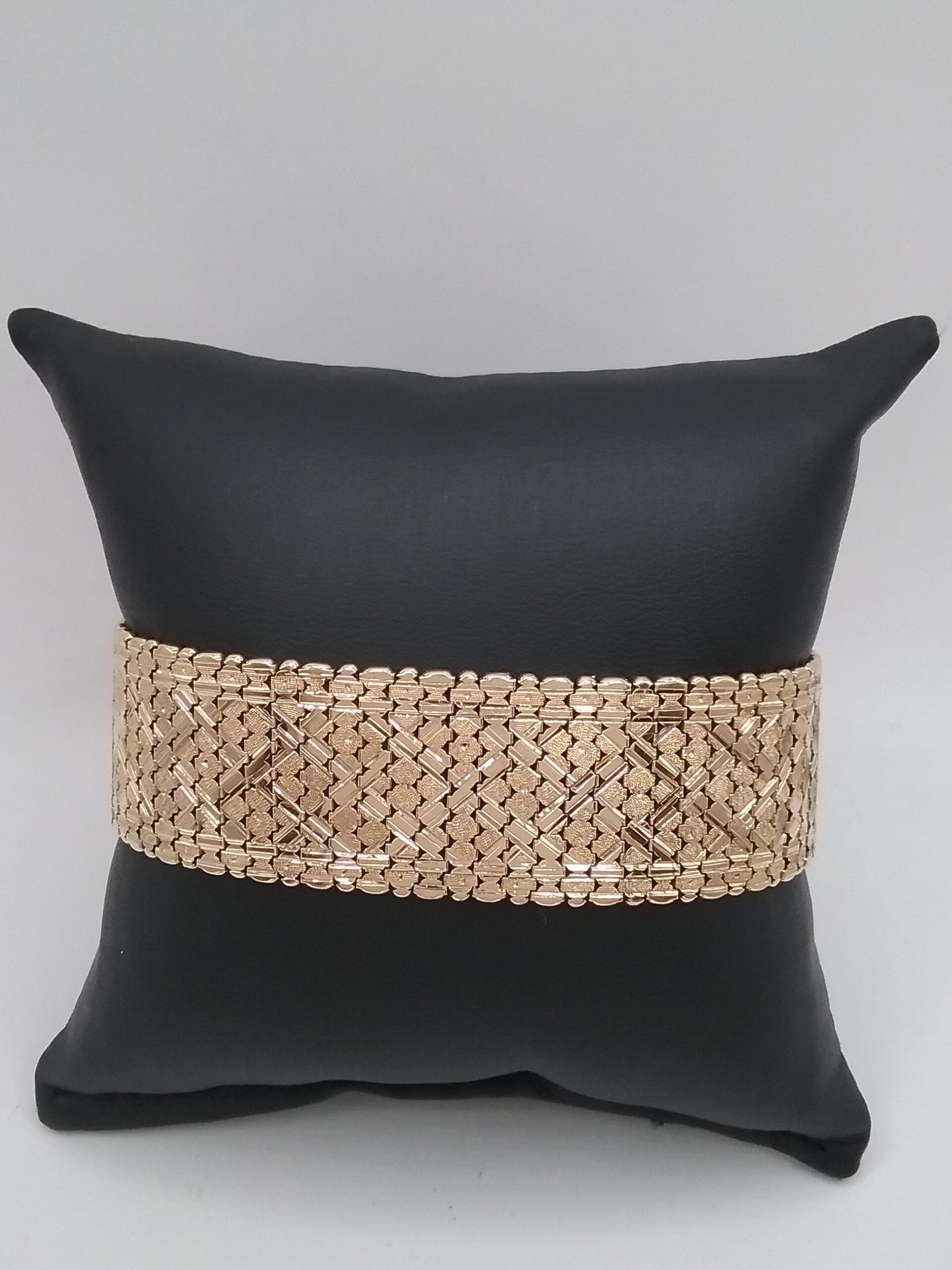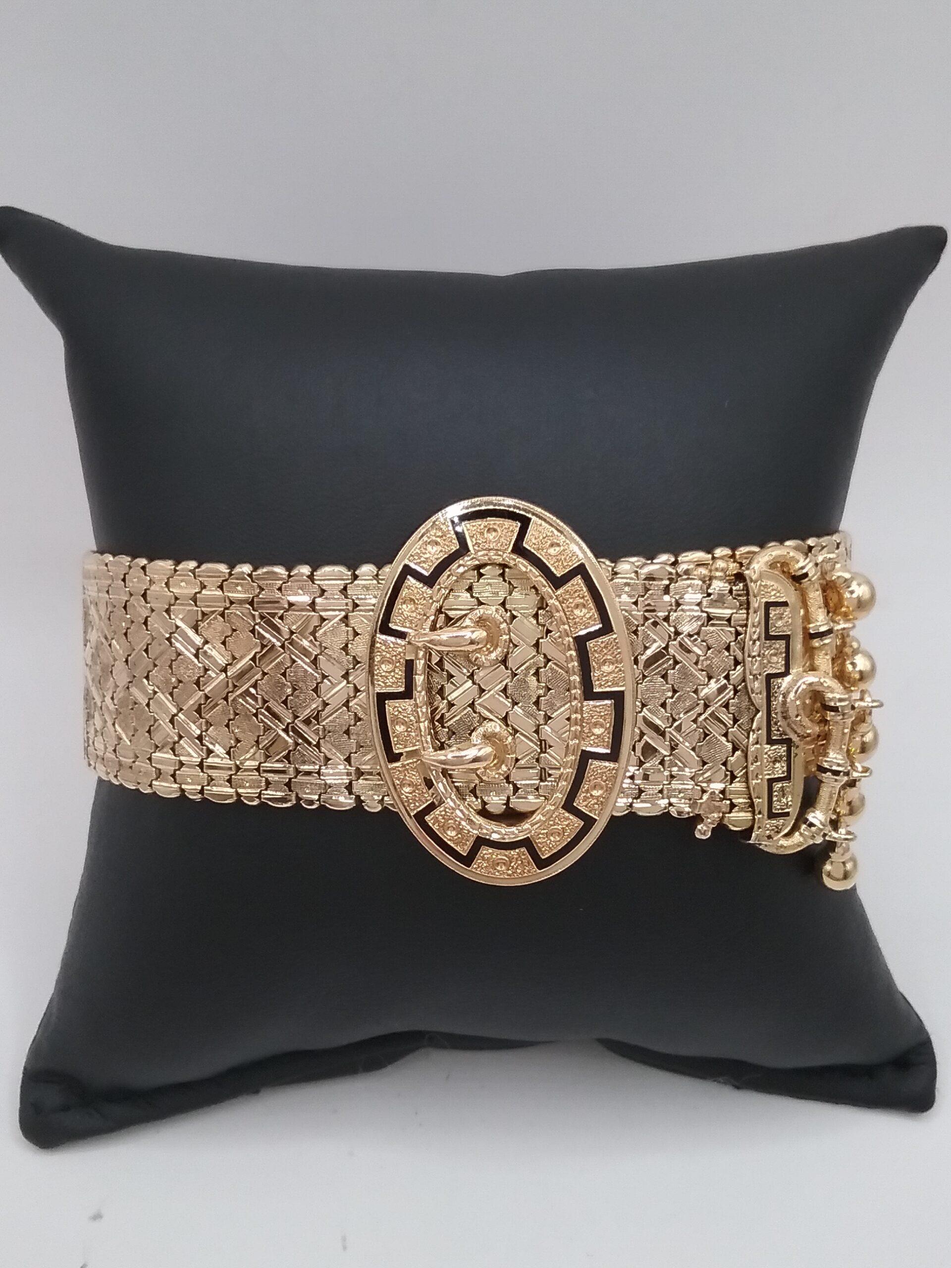Bracelet manchette en or jaune 750/1000e pesant 45,50 gr motif boucle de ceinture émail noir avec pampilles
