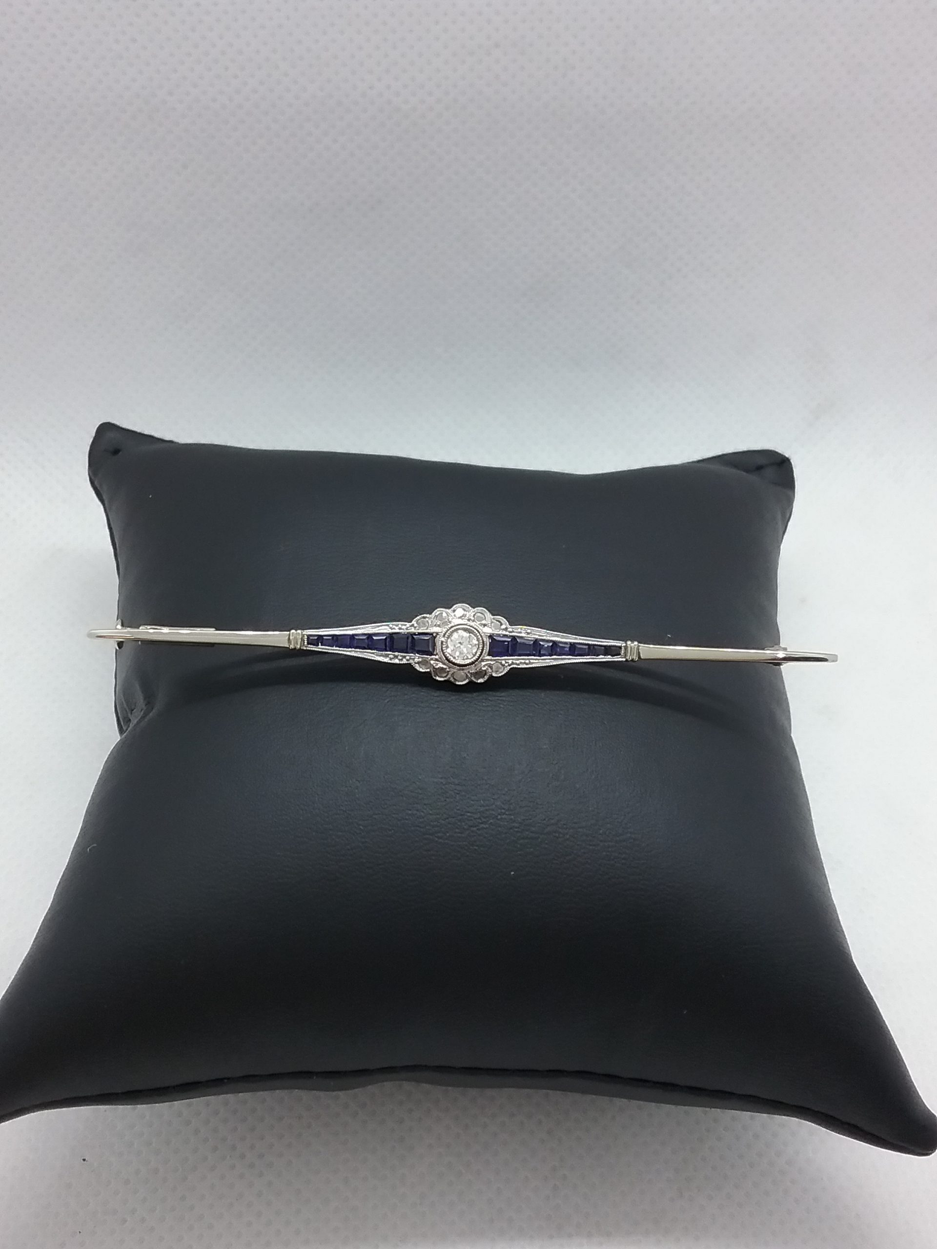 Broche barrette en or blanc 750/1000e pesant 4,90 gr sertie de diamants taille rose et saphirs calibrés avec diamant central en taille ancienne 0.10 ct