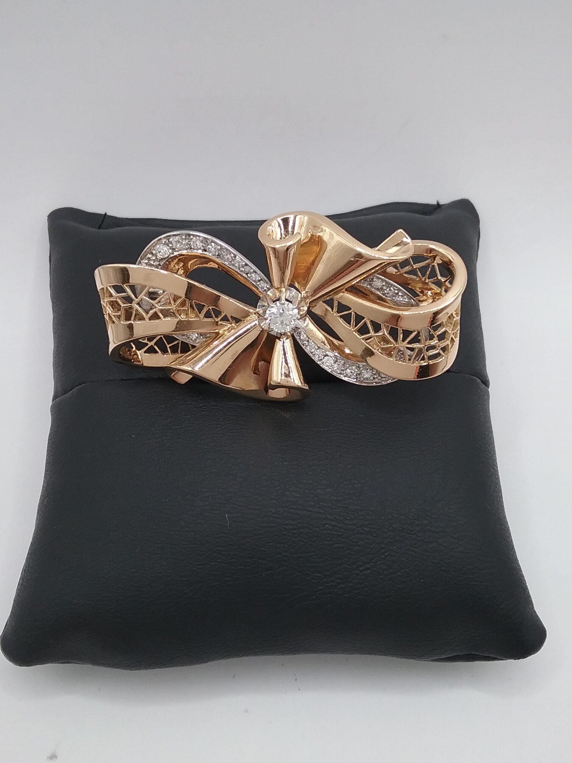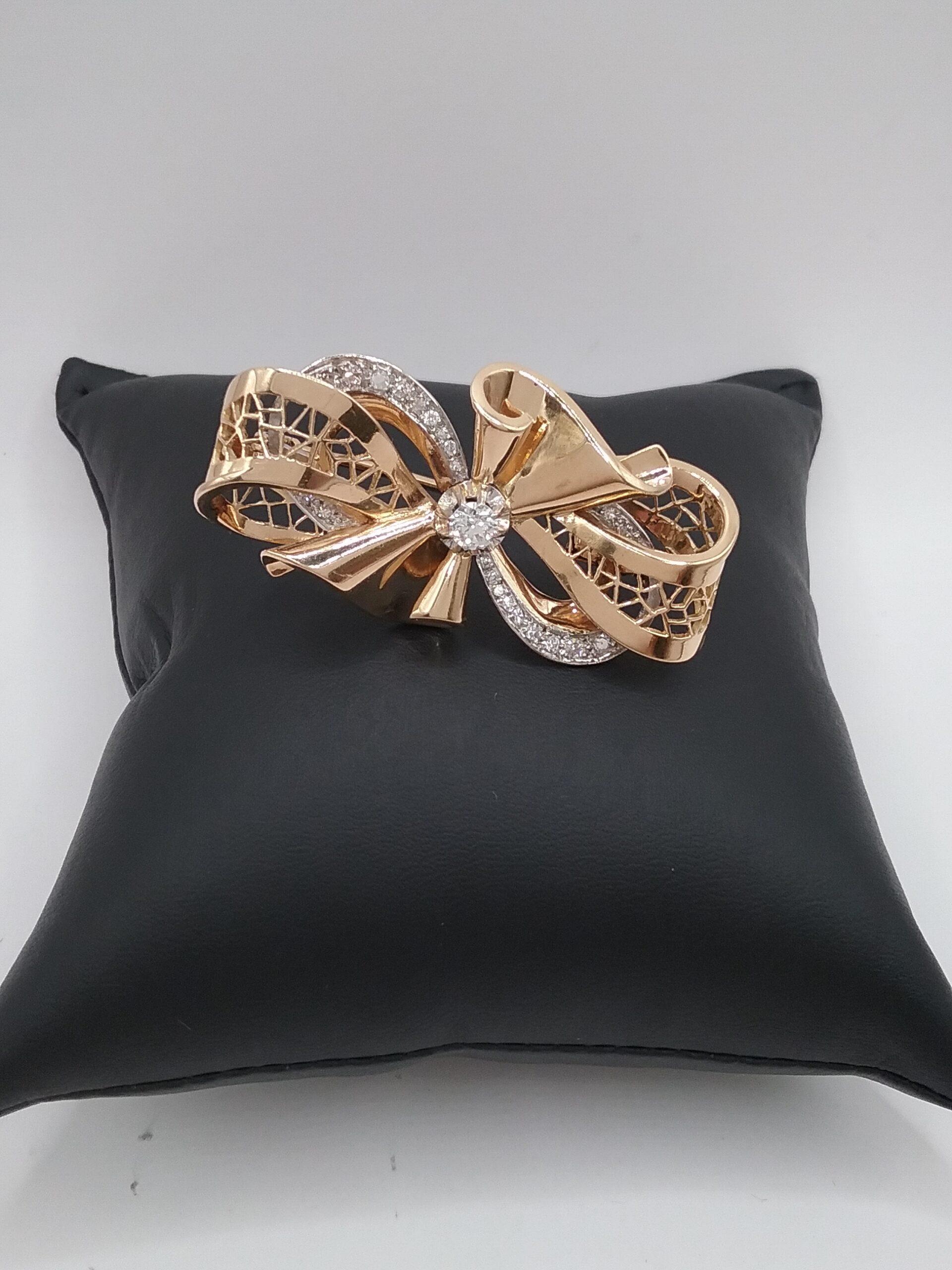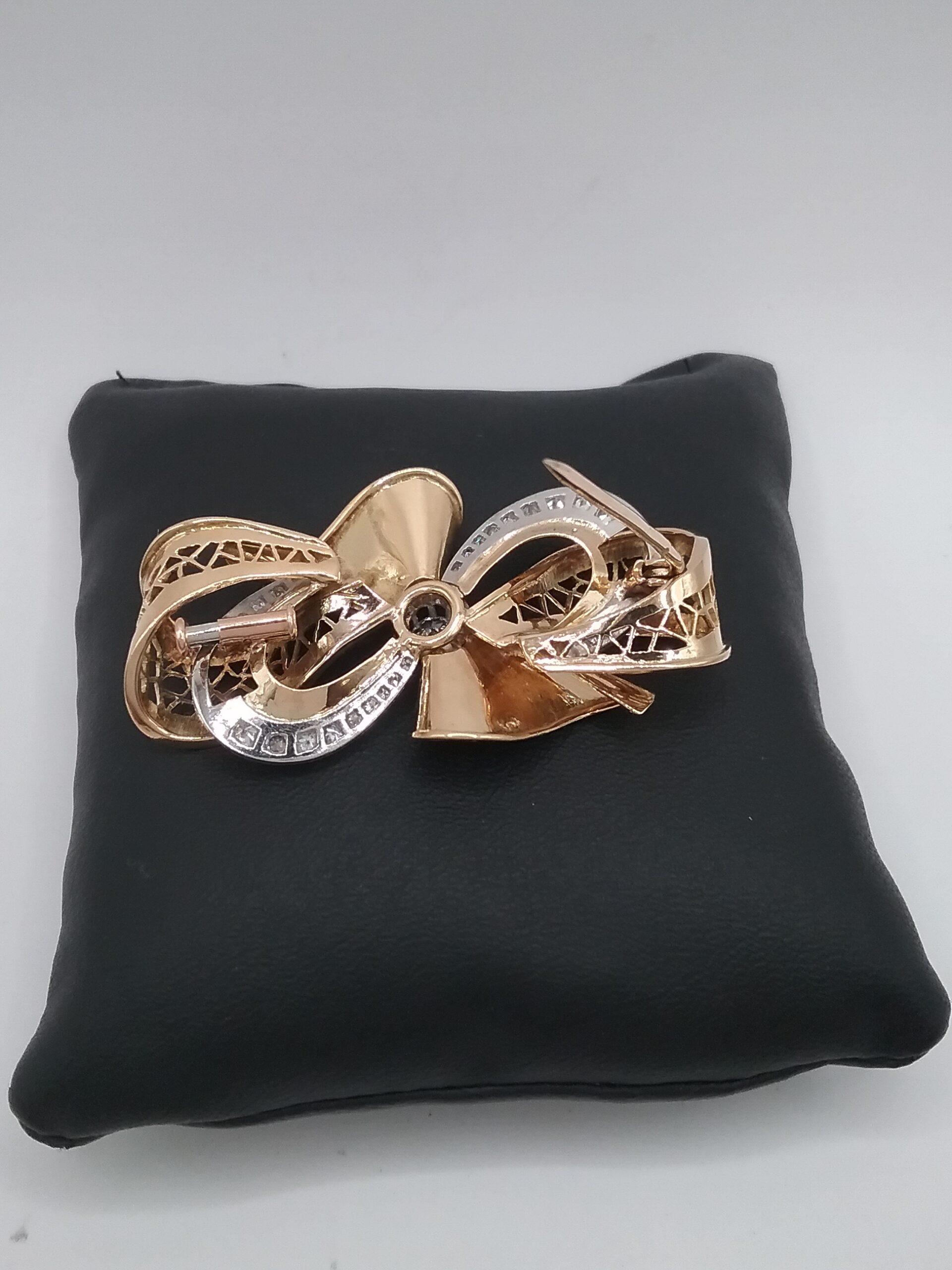 Broche en or rose et or blanc 750/1000e pesant 12,14 gr sertie au centre d’un diamant taille ancienne de 0,30 ct et de diamants