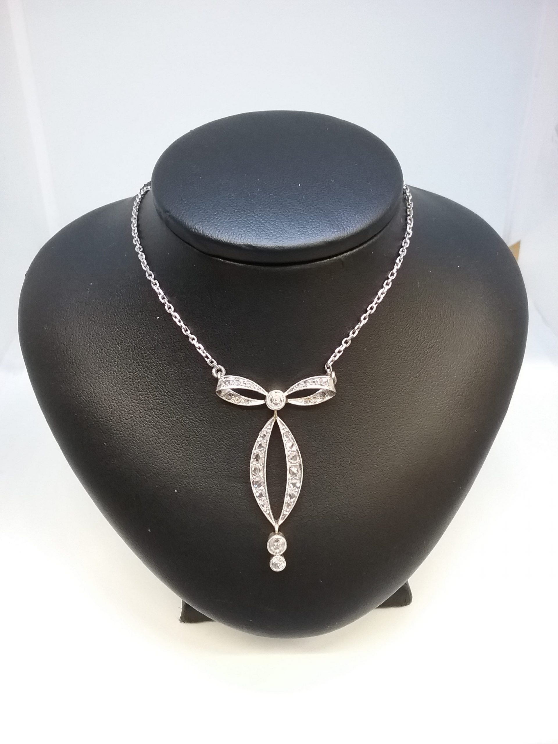 motif nœud serti de diamants taille ancienne et taille rose pesants 0.40 ct et roses début XXe siècle
