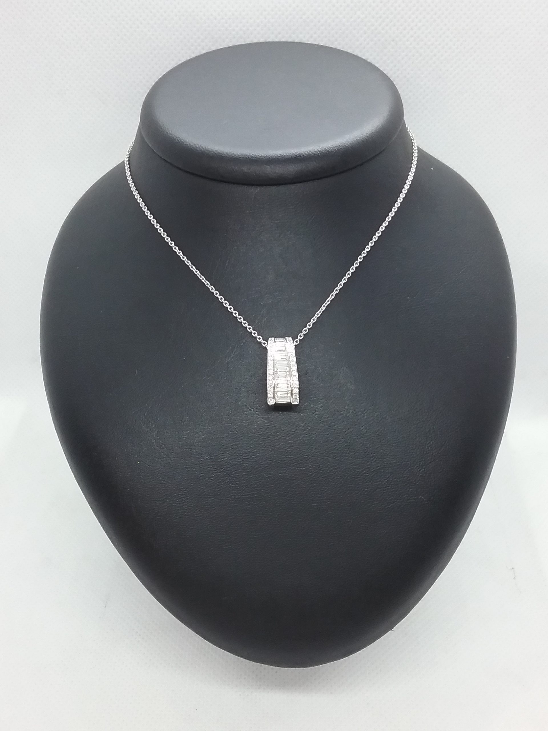 Collier pendentif en or blanc 750/1000e pesant 5,40 gr serti de diamants taille brillant et baguette