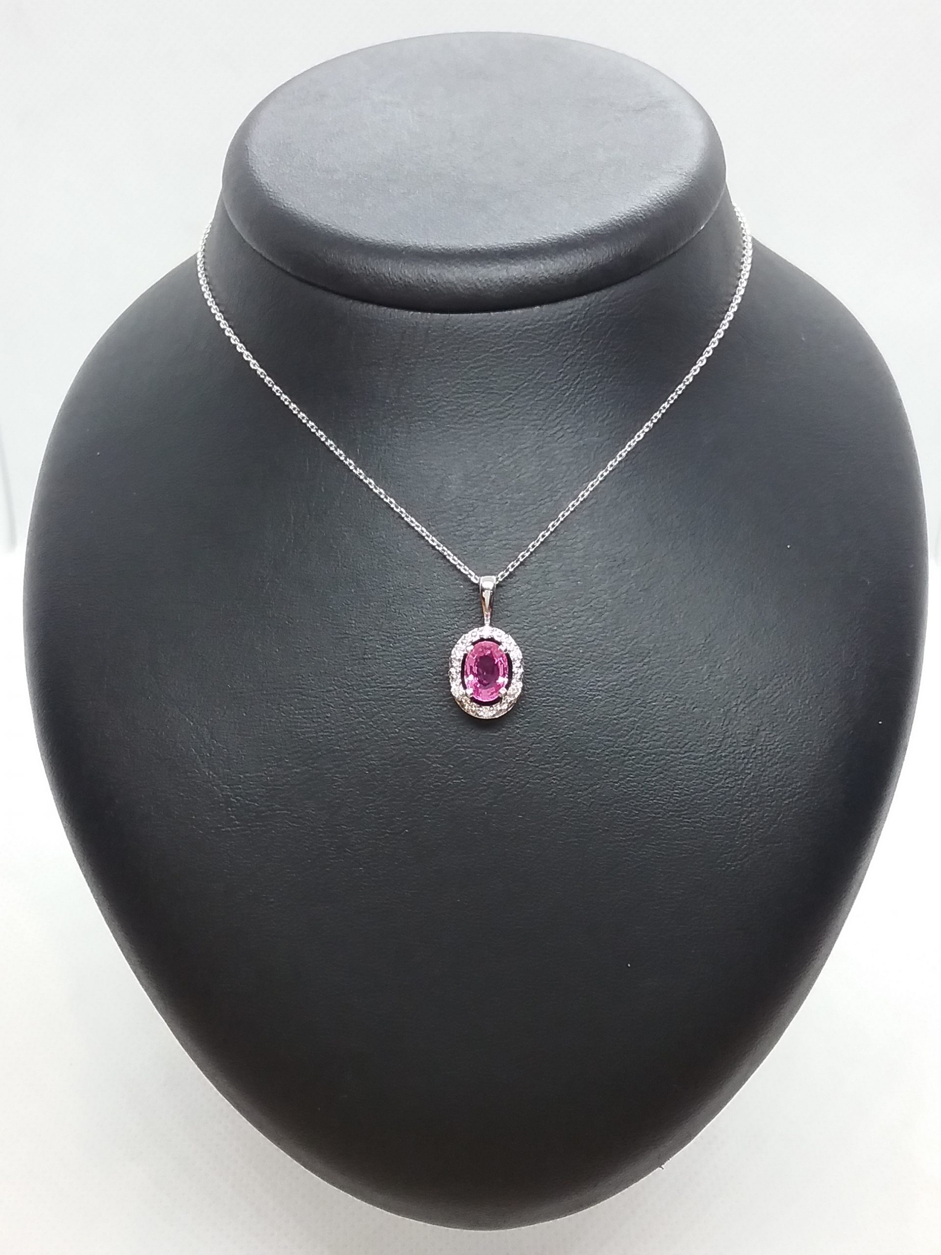 Pendentif en or blanc 750/1000e pesant 1,56 gr saphir rose ovale de 0,90 ct entourage diamants de 0,07 ct