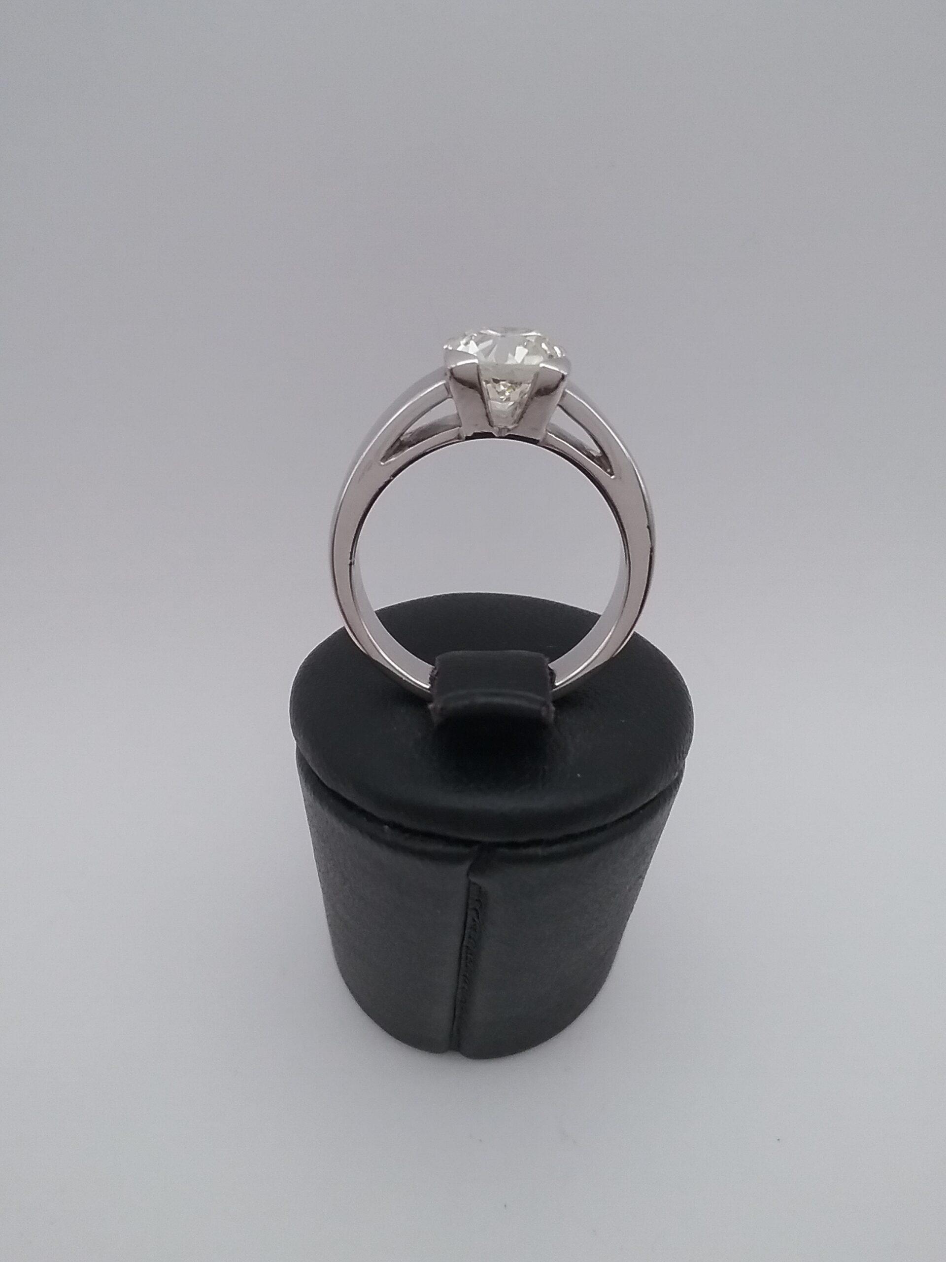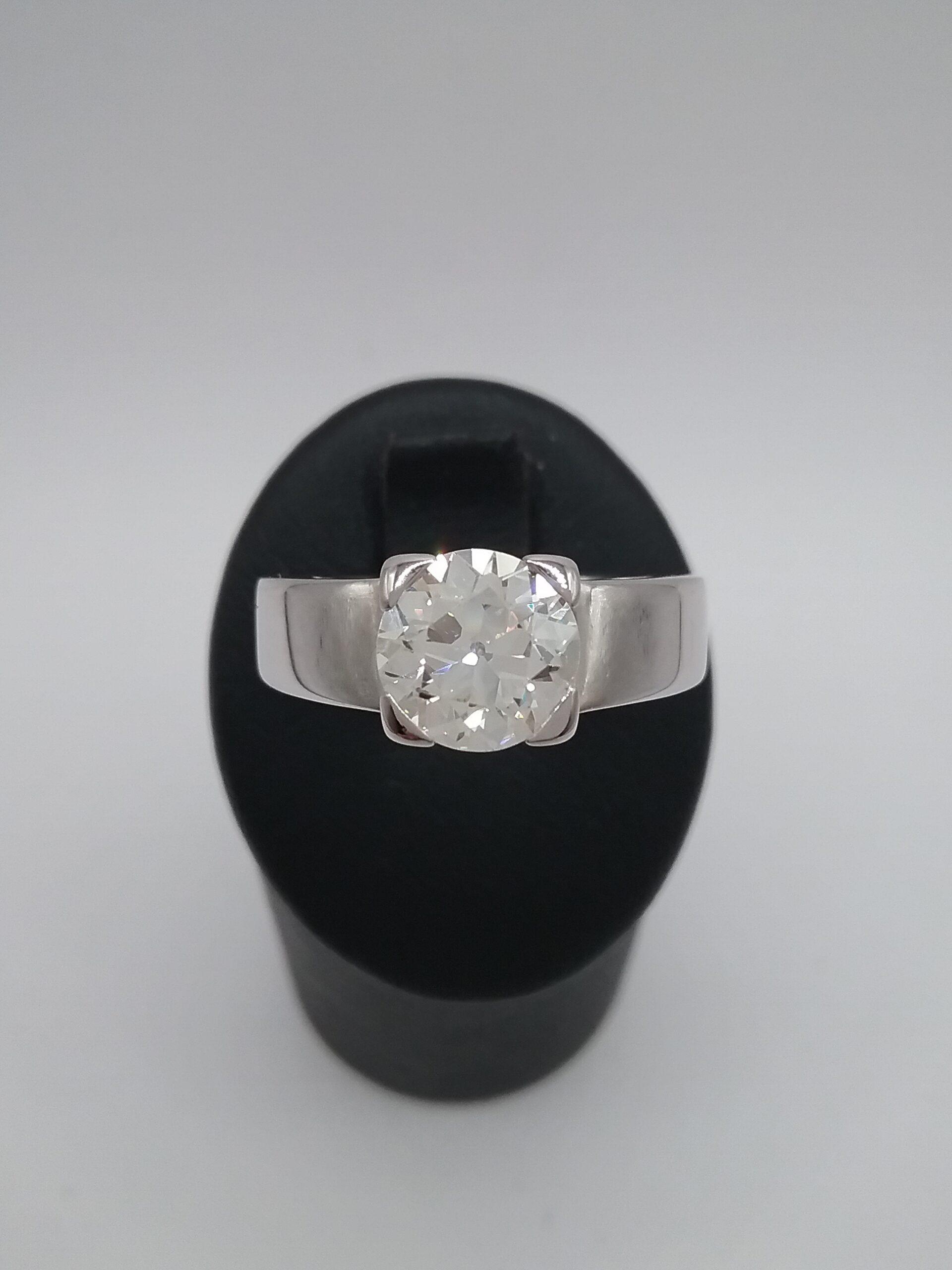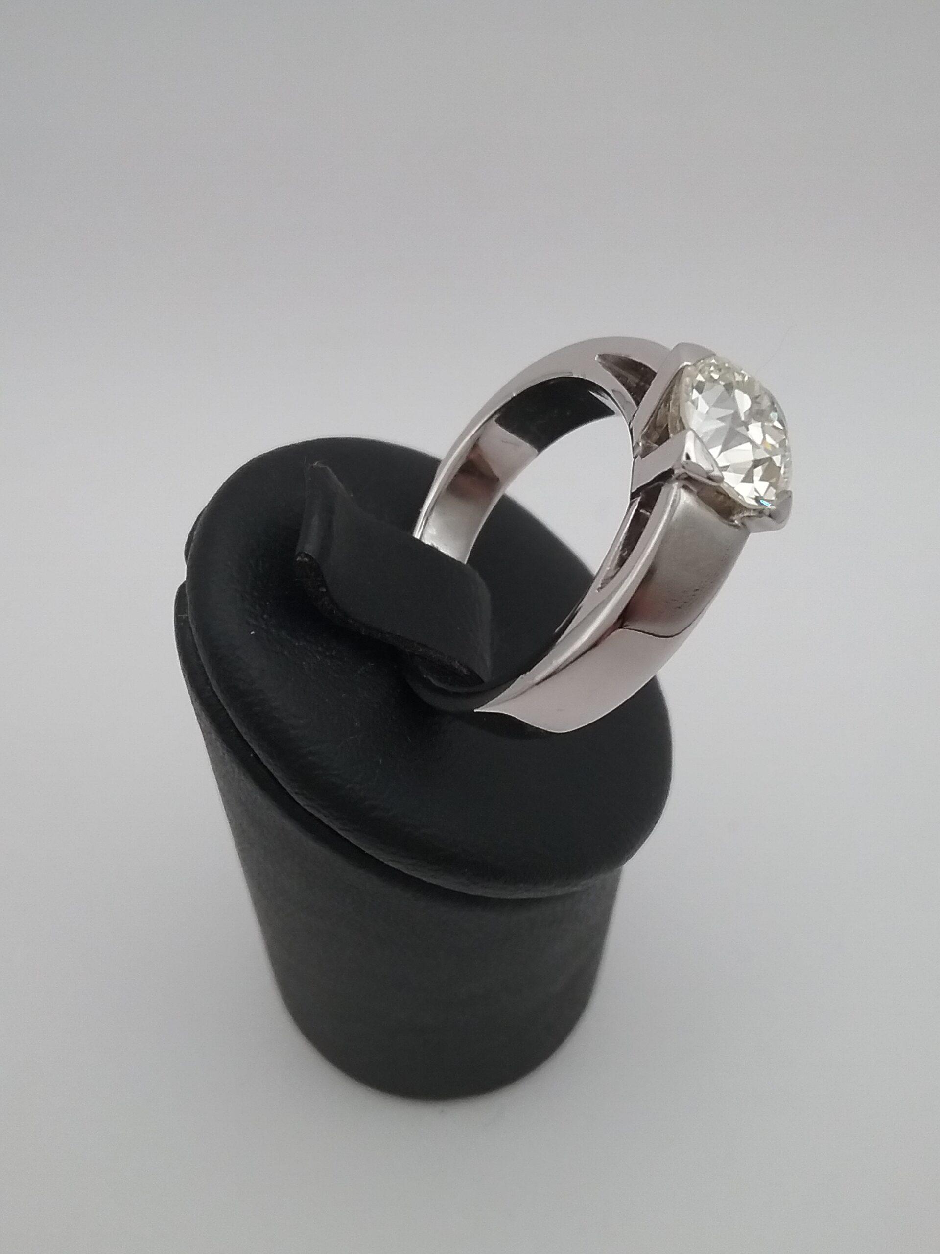 Bague solitaire en or blanc pesant 8,80gr sertie d’un diamant d’1,90 carat JVS2 taille ancienne