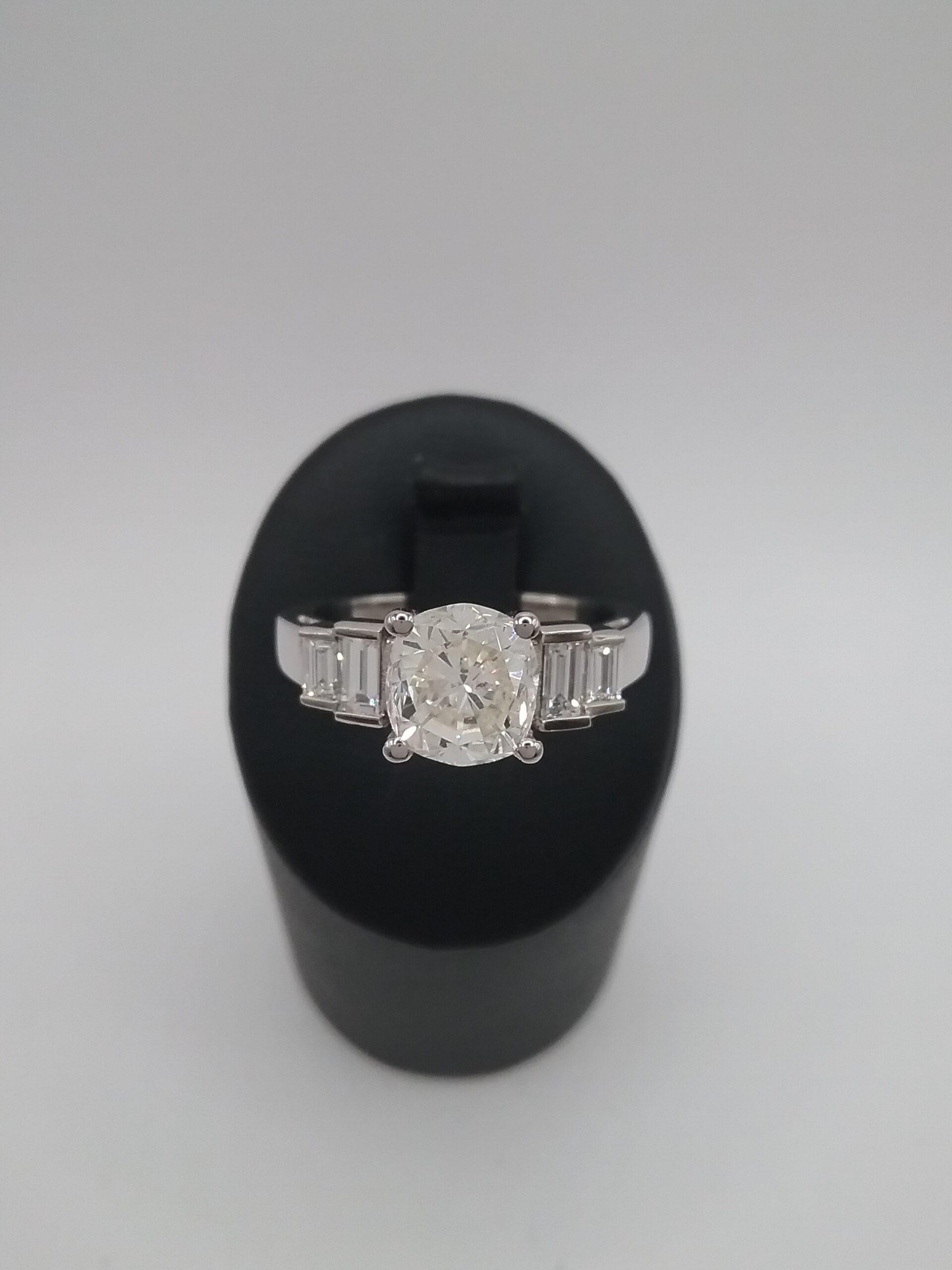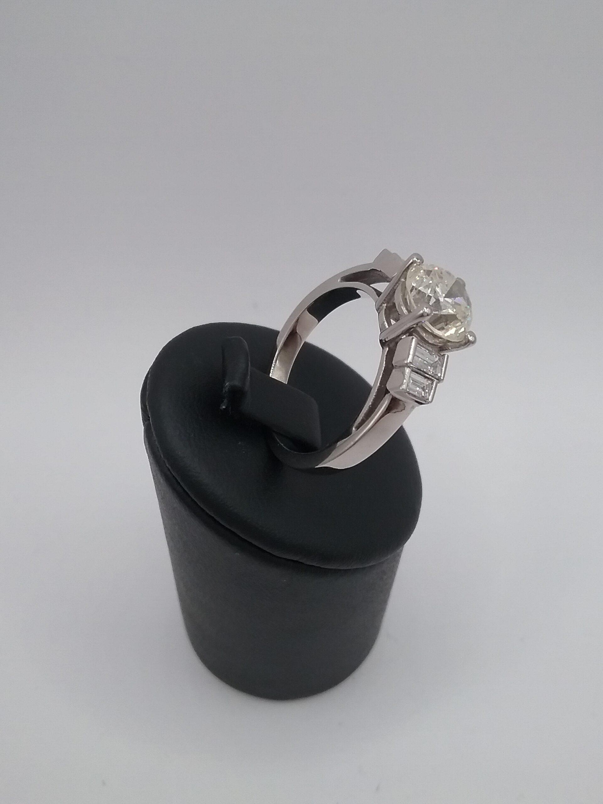 Bague solitaire en or blanc pesant 5,37 gr sertie d’un diamant taille ancienne pesant 1,84 carat accompagné de 4 diamants baguettes d’un poids total de 0,39 ct